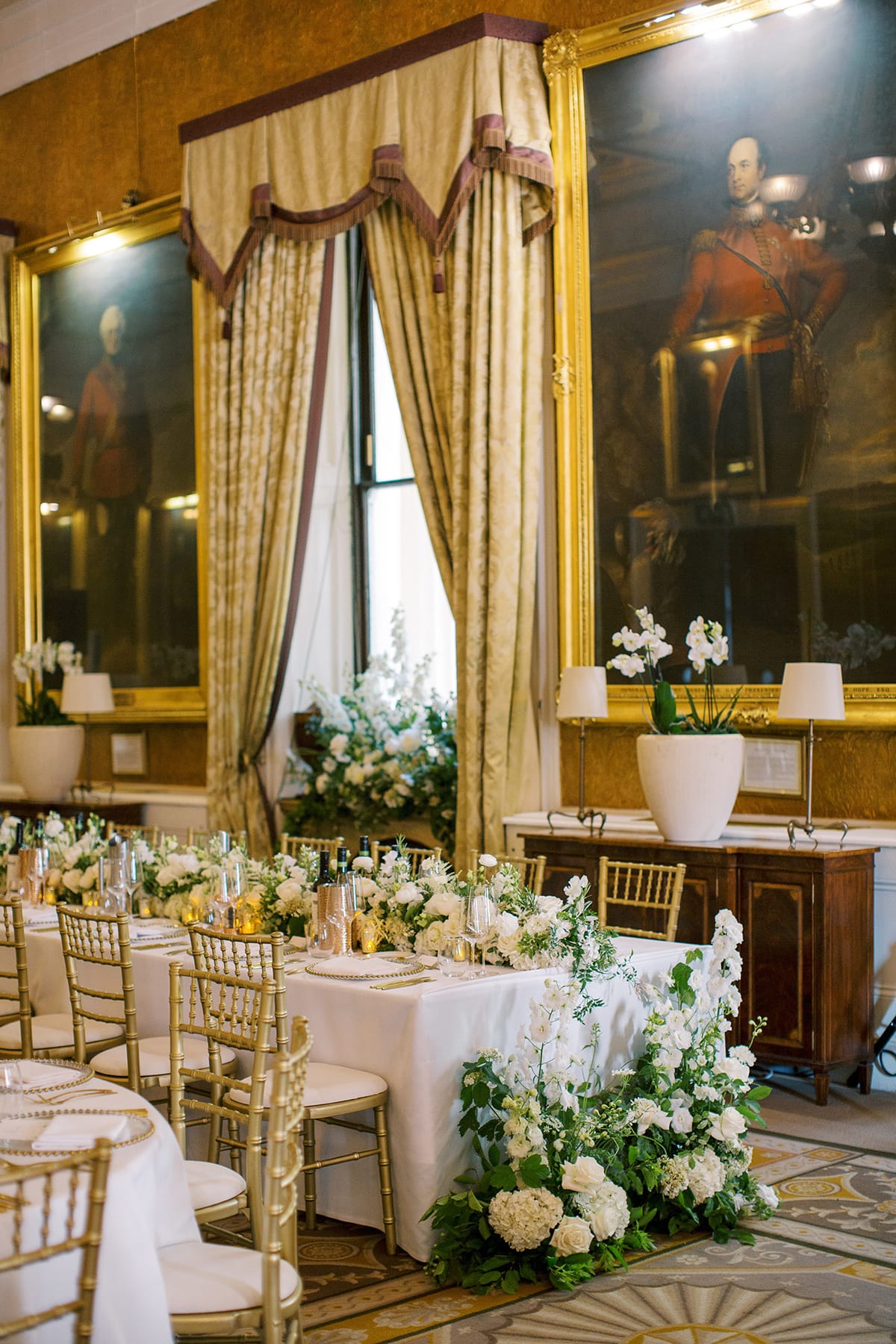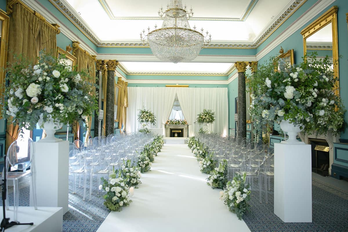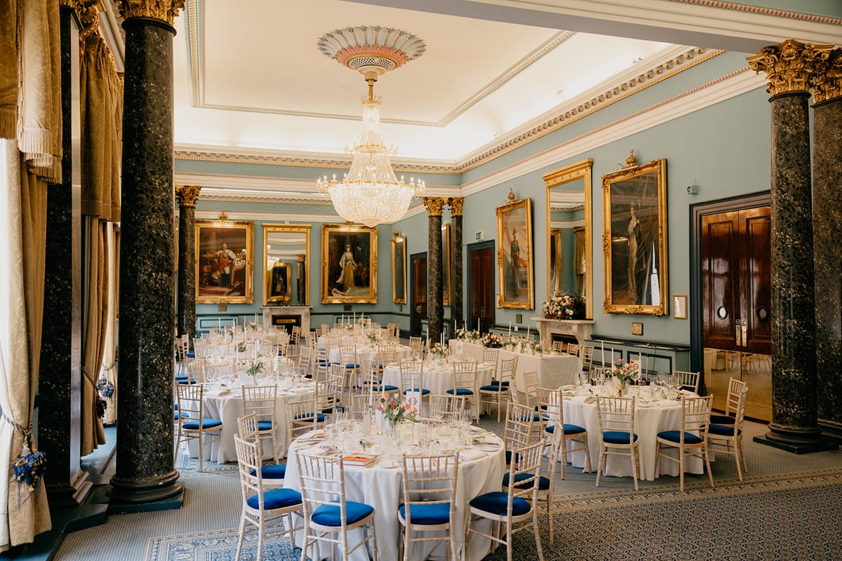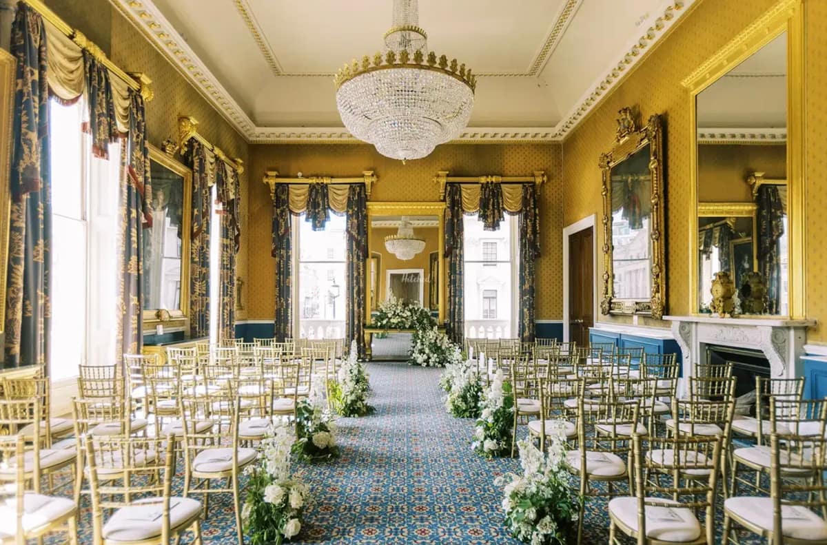 Couples can exchange vows in a variety of breathtaking spaces, from the grand staircase beneath a 15ft Regency chandelier to the intimate Waterloo Room with its floor-to-ceiling windows. Larger ceremonies can take place in the Nash Room, which connects seamlessly to The Waterloo for additional space. For an outdoor setting, the Garden & Terrace offers a botanical backdrop with Georgian elegance.