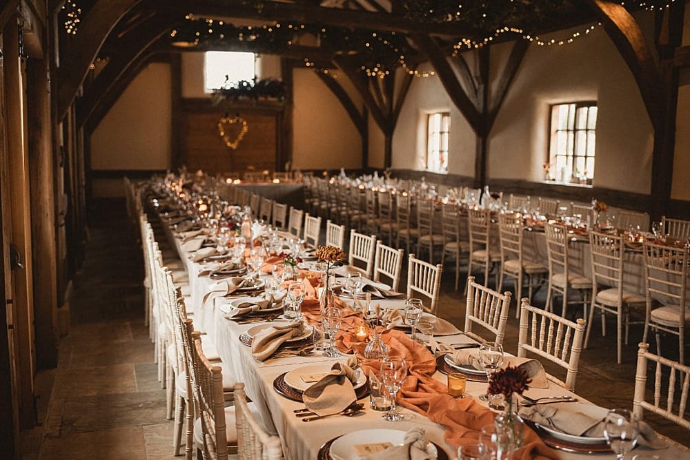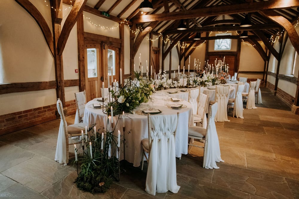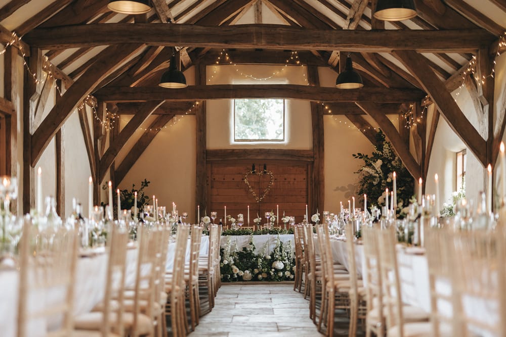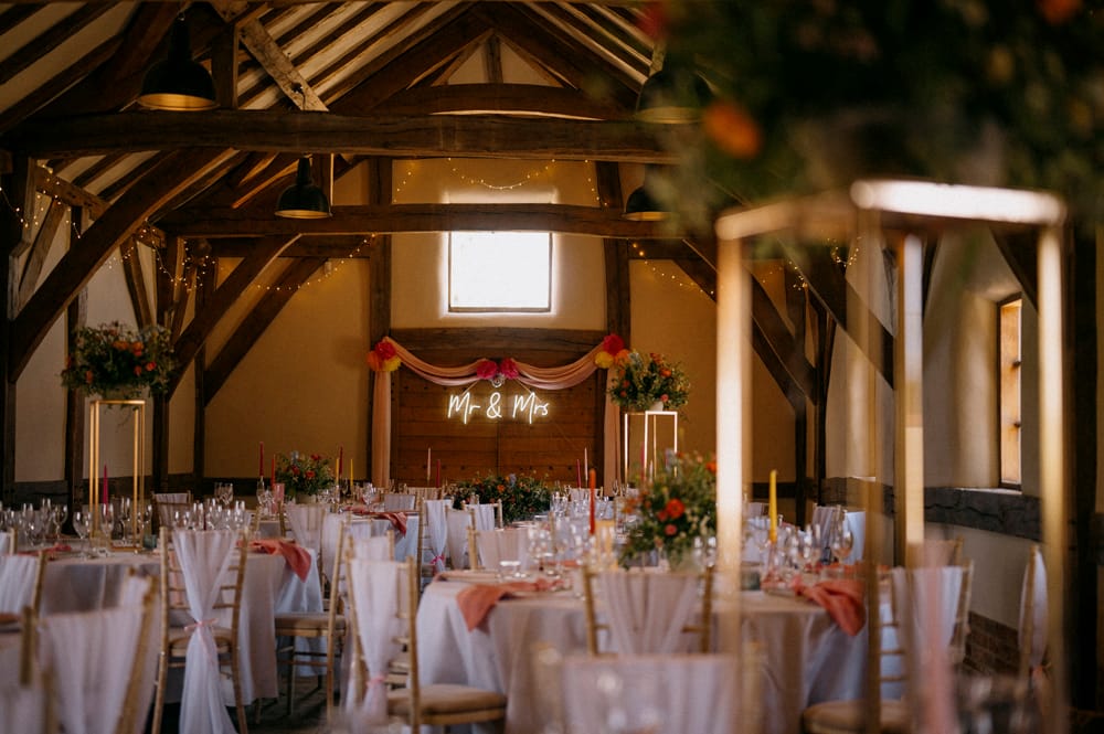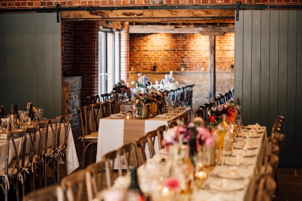 The venue accommodates up to 160 seated guests during the day and 250 in the evening, offering the flexibility for both grand celebrations and intimate gatherings. You can personalise your reception layout, choosing between long banquet tables or round arrangements, and decide which barn best suits your party size and style.