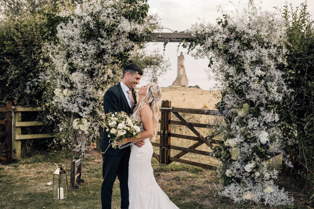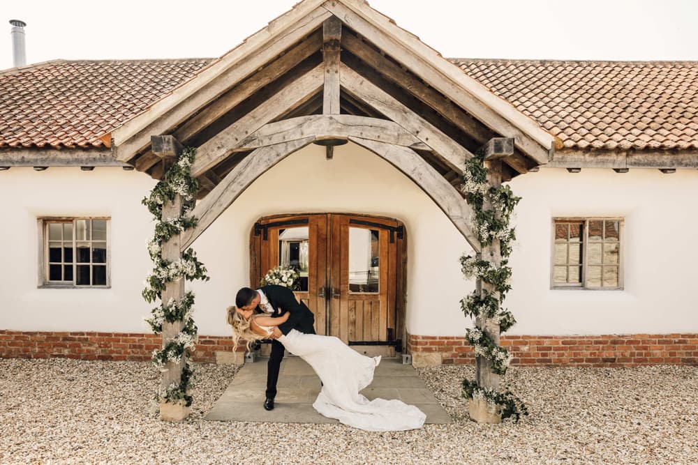 Abbey Farm Weddings in rural Lincolnshire offers a blend of rustic charm and understated luxury. The beautifully restored barns, surrounded by lush gardens and meadows, frame the historic Kirkstead Abbey Ruin, creating a timeless backdrop.