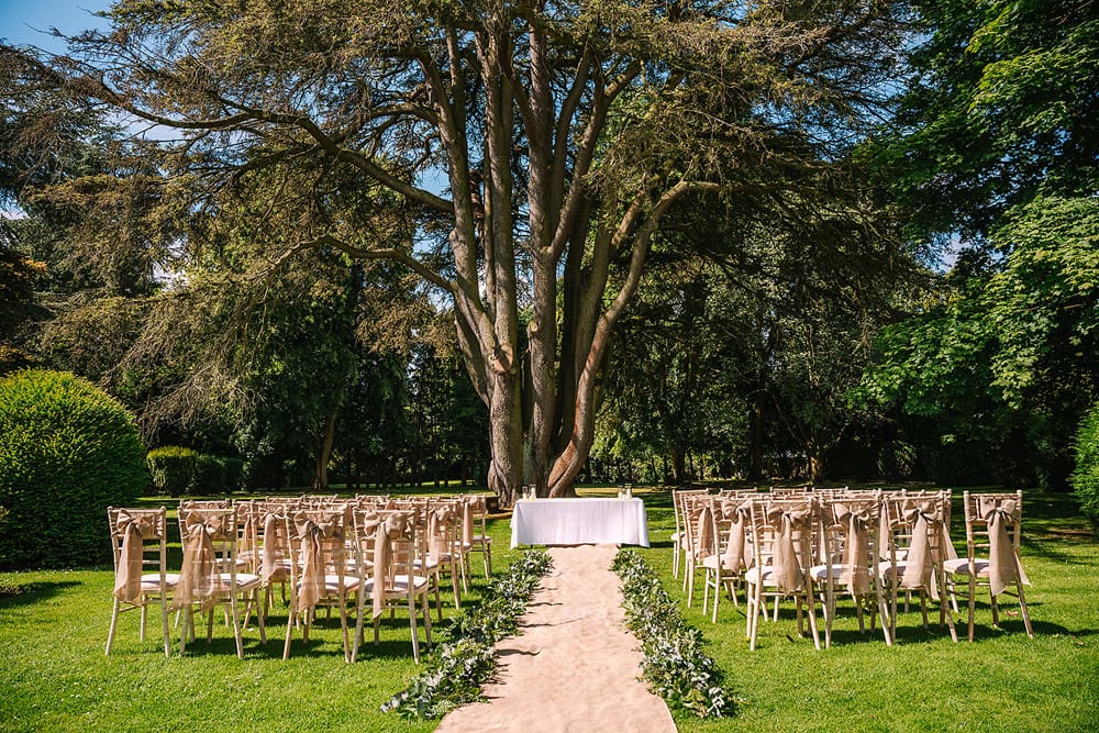 The landscaped garden at Ansty Hall provides a stunning location for an outdoor ceremony. Beneath the towering 350-year-old cedar tree, couples can exchange vows surrounded by nature, with space for 150 guests.
