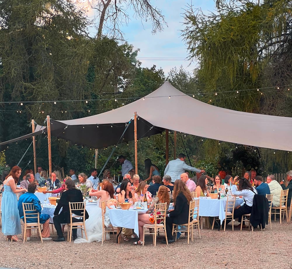 Outdoor Options: Stretch tents create sheltered outdoor space beside the house or barns. From 2026, the Walled Garden will accommodate marquee receptions for up to 250 guests, with level lawns and uninterrupted views.