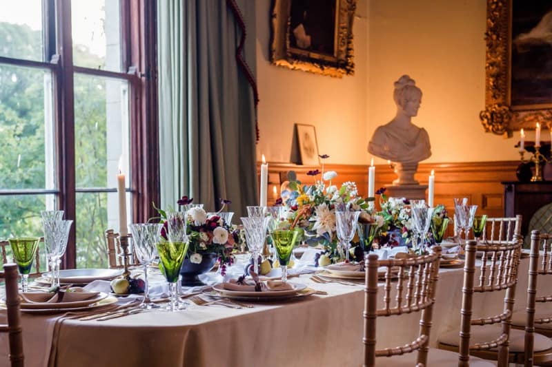 Receptions at Birdsall House offer an idyllic setting in the formal gardens or inside the venue’s impressive reception rooms. Guests can sip champagne on the terrace overlooking the lakes or enjoy lawn games in the historic garden, where colourful blooms create a vibrant atmosphere in spring and summer. For indoor receptions, four elegant staterooms accommodate gatherings of various sizes, while marquees in the garden extend the celebration space, ensuring a memorable day for everyone.