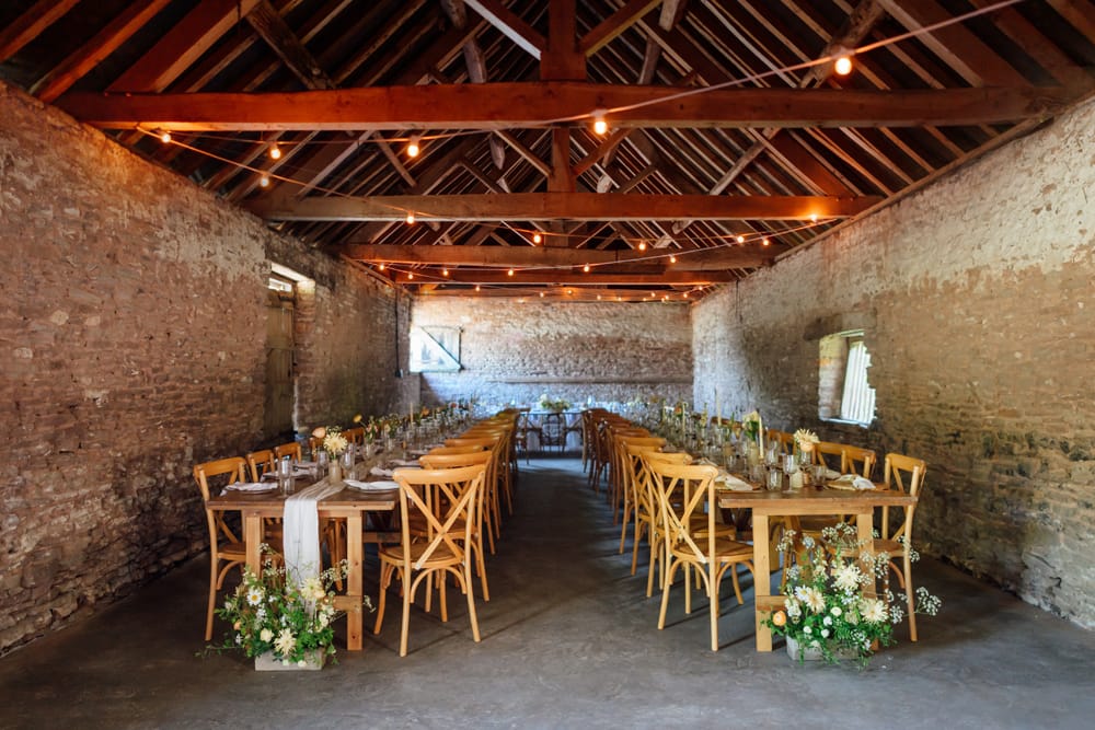 Reception options at Broadfield are as versatile as they are picturesque. For smaller weddings, the dining room’s grand, elegant ambience is ideal for up to 50 guests, with dancing in the separate bar building as night falls. Larger gatherings of up to around 96 can enjoy dining and dancing in the fold yard with its adaptable structure, or even larger groups of up to 170 can host a tipi or marquee overlooking the rolling Herefordshire countryside. Or new for weddings from 2026 onwards, the Broadfield barn can seat around 100 to dine, and then more to dance.