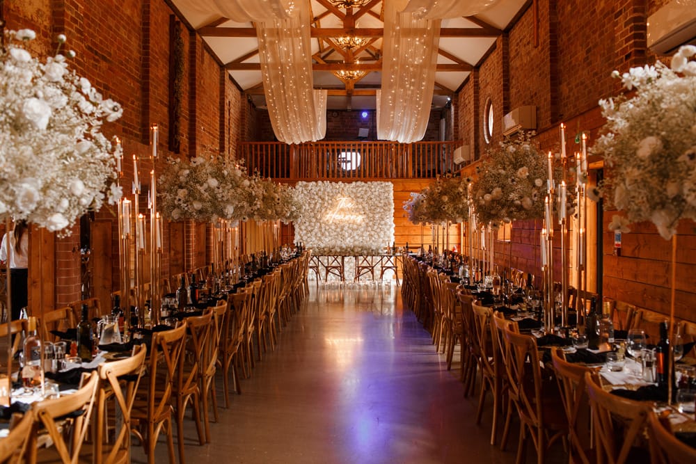 Burlton Manor, an elegantly restored 18th-century Georgian brick barn, lies in the North Shropshire countryside just outside Shrewsbury. The venue combines historical charm with sophisticated modern design, creating a unique space for wedding celebrations. Its open-plan interior, bathed in natural light and accented by fairy-lit walkways and a spacious terrace, offers a blank canvas for your personalised wedding vision.