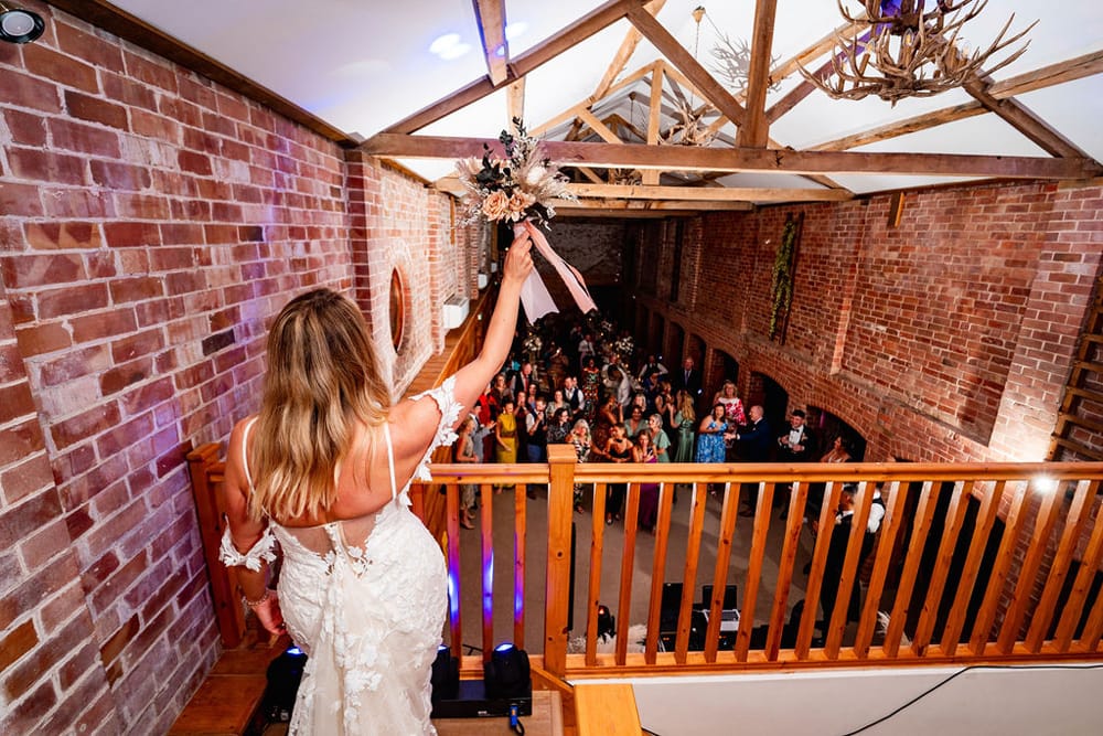 For receptions, Burlton Manor’s main hall invites guests to an inspiring space featuring exposed brickwork, handcrafted oak doors, and towering oak beams. Elegant chandeliers light up the dining area, where an elevated balcony adds a unique view of your celebration. The spacious outdoor terrace flows naturally from the main hall, providing an open area where guests can mingle and enjoy the setting.