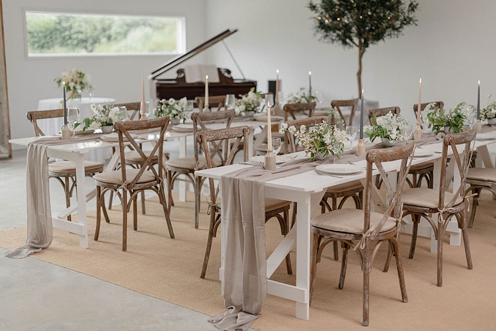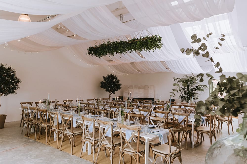 Camel Studio is not a typical rustic barn with its white walls, muslin drapes and festoon lights. Trestle tables, pretty cross-back chairs, a grand piano, olive trees and large ferns complement this beautiful canvas for you to style as you choose. The outside courtyard has a Mediterranean feel with olive trees, flower-filled pots, comfortable seating and pretty blue and green parasols.