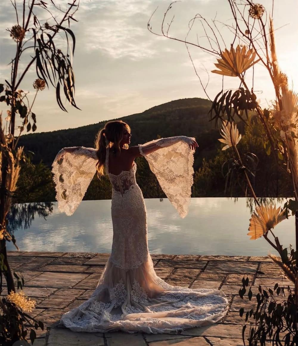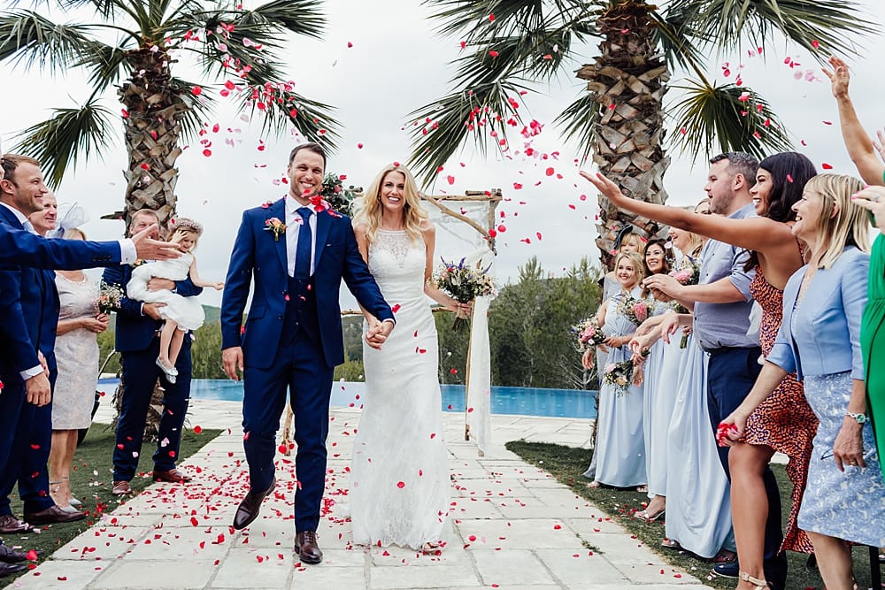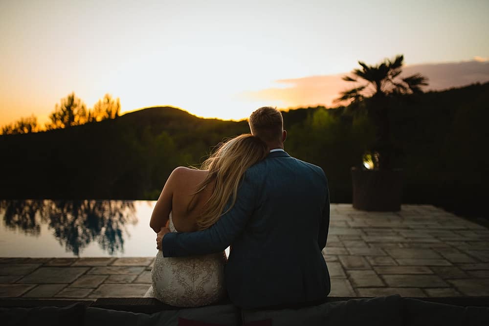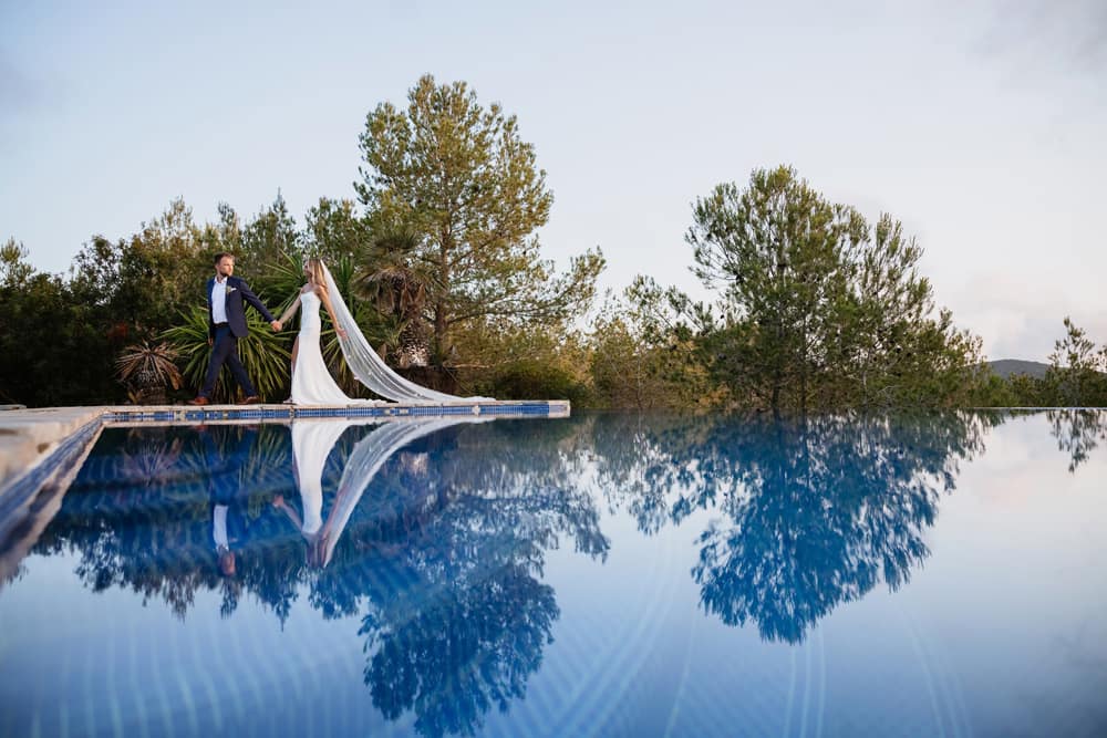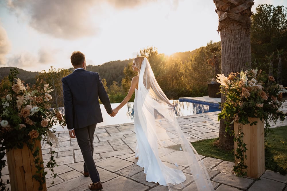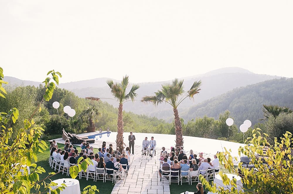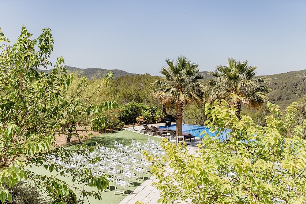 Ceremonies unfold beneath the Catalan sunshine in the secluded poolside area, where the surrounding pine trees provide natural shade and privacy. Alternatively, the upper terrace offers panoramic views of the mountains, creating an unforgettable backdrop as vows are exchanged. Both spaces embrace the outdoors, with stone features and manicured grounds enhancing the natural beauty of each setting.