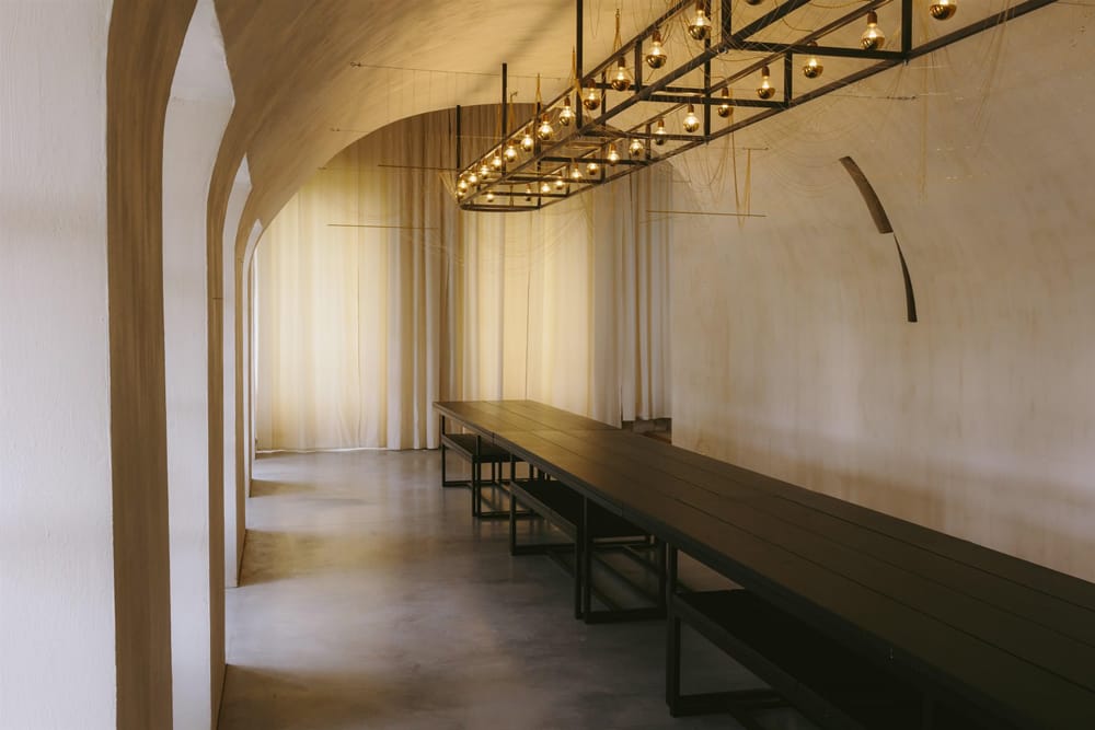 For a more intimate experience, couples can choose a vaulted indoor room featuring a gracefully curved ceiling and an artistic lighting installation, providing a warm and inviting atmosphere for their vows.