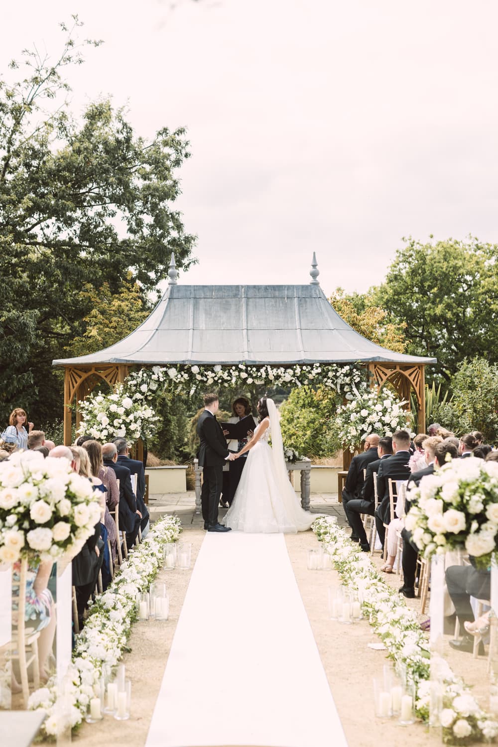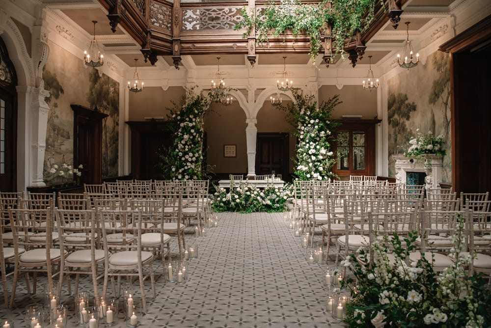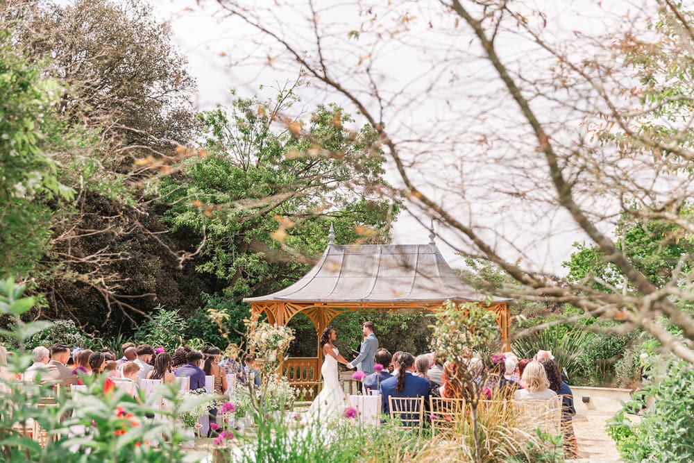 There are several spaces available for your wedding ceremony at Clevedon Hall. Couples can choose from the outdoor Gazebo for an al-fresco experience, the light-filled Orangery, the stately Grand Library, or the stunning Great Hall. Each space offers its own unique charm, allowing you to select the perfect backdrop for your vows.