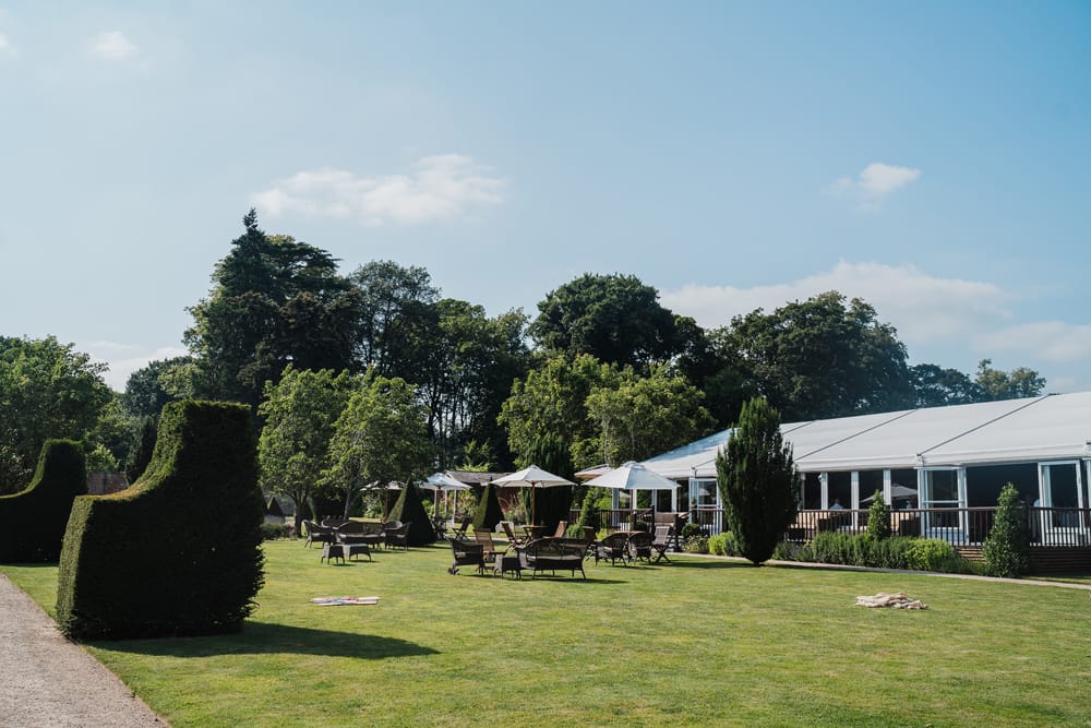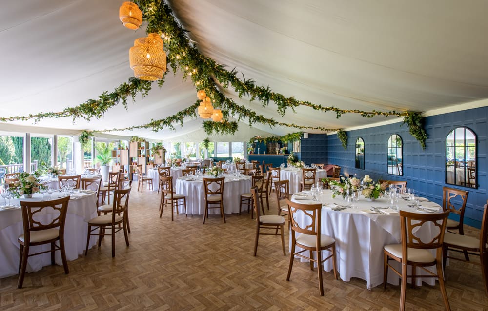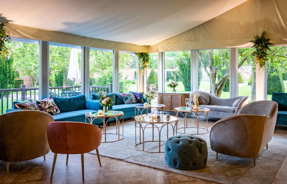 The Pavilion is your reception space: a light-filled, contemporary venue that complements the estate’s historic charm. With a chic bar and lounge area, a stylish glass-fronted terrace for relaxed outdoor mingling, and a beautifully finished dining room that reflects the garden’s elegance, it’s an adaptable space perfect for each stage of your celebration.