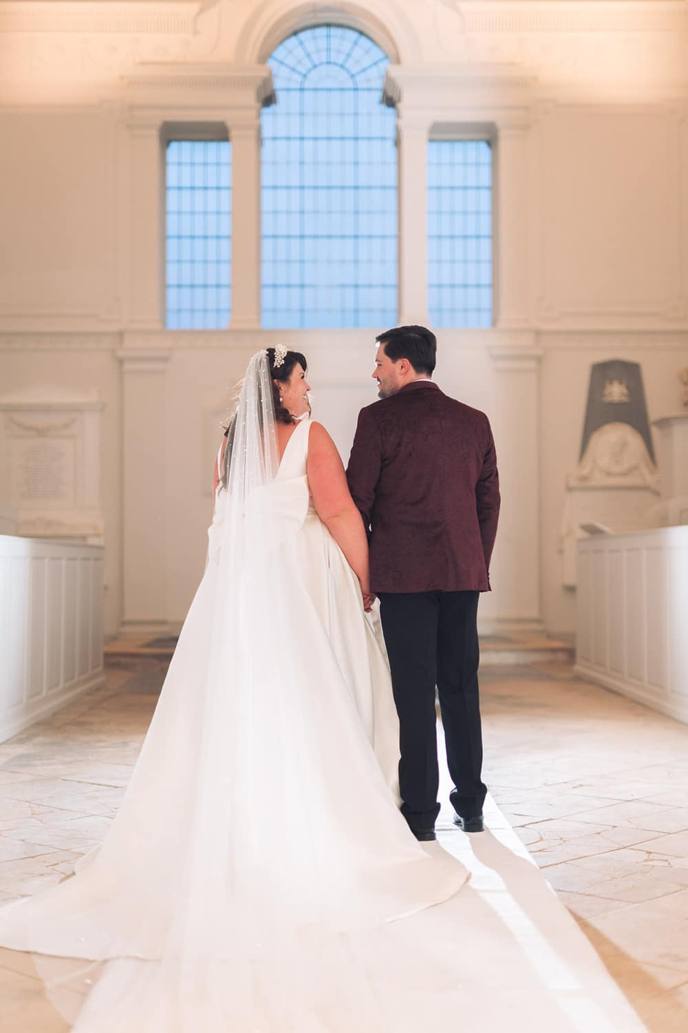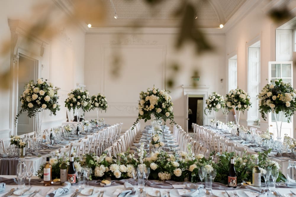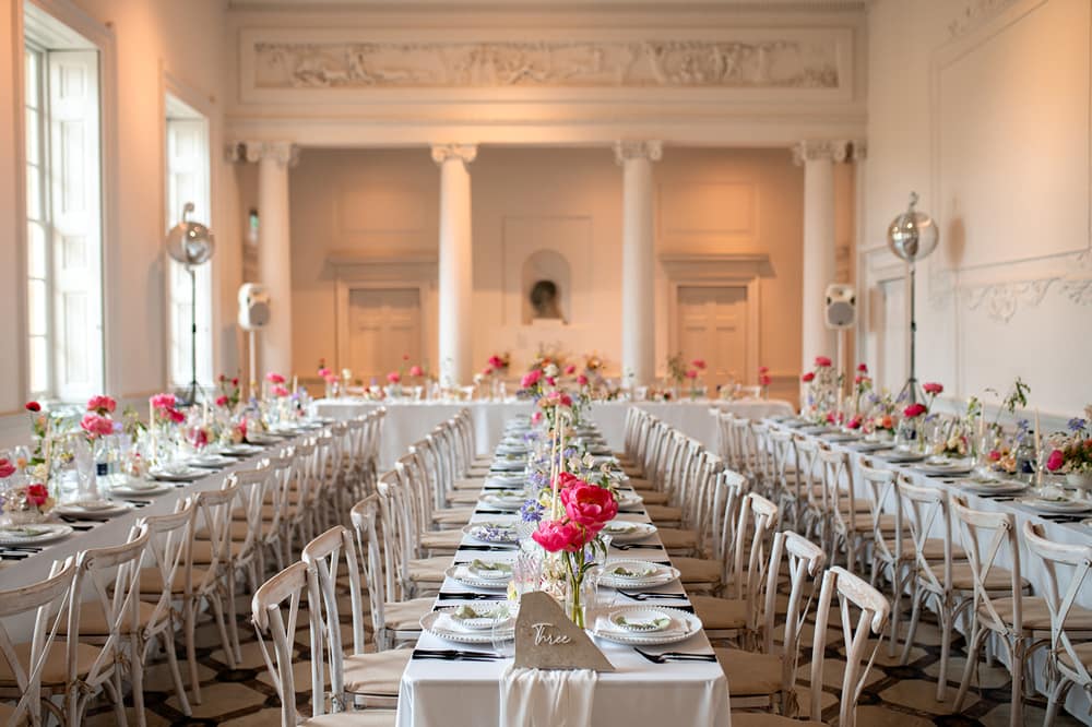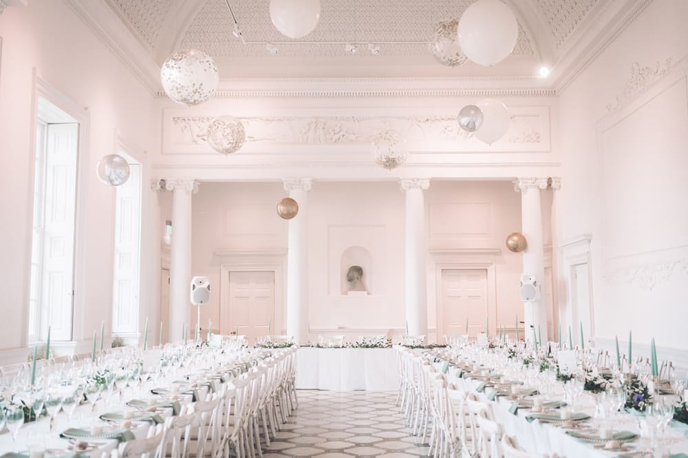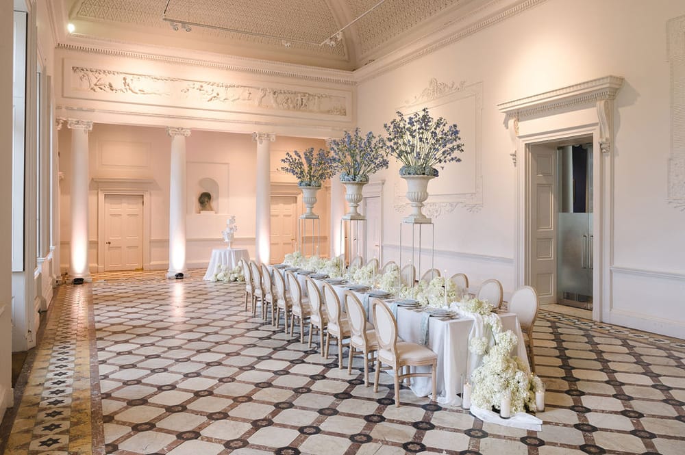 The Adam Hall hosts the wedding breakfast, with large picture windows, original marble floors and a muted colour palette that suits both classic and contemporary styling. As evening arrives, the hall transforms into the setting for dancing, with a checkerboard dancefloor providing a clear centre for the night ahead.