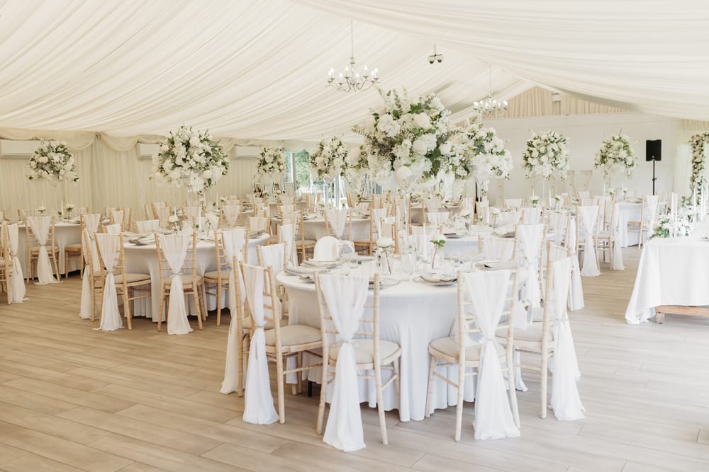 If you use our in-house catering, crockery and cutlery are included. We provide white tablecloths only. If you prefer another colour, you will need to source it. We do not provide napkins, as these typically tie into your décor's colour scheme.
