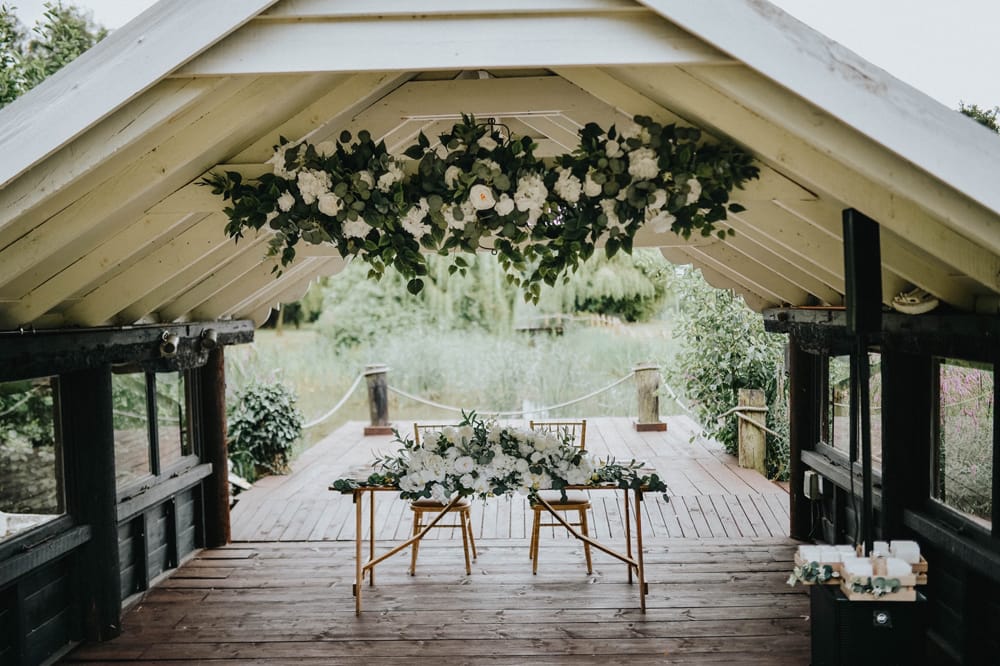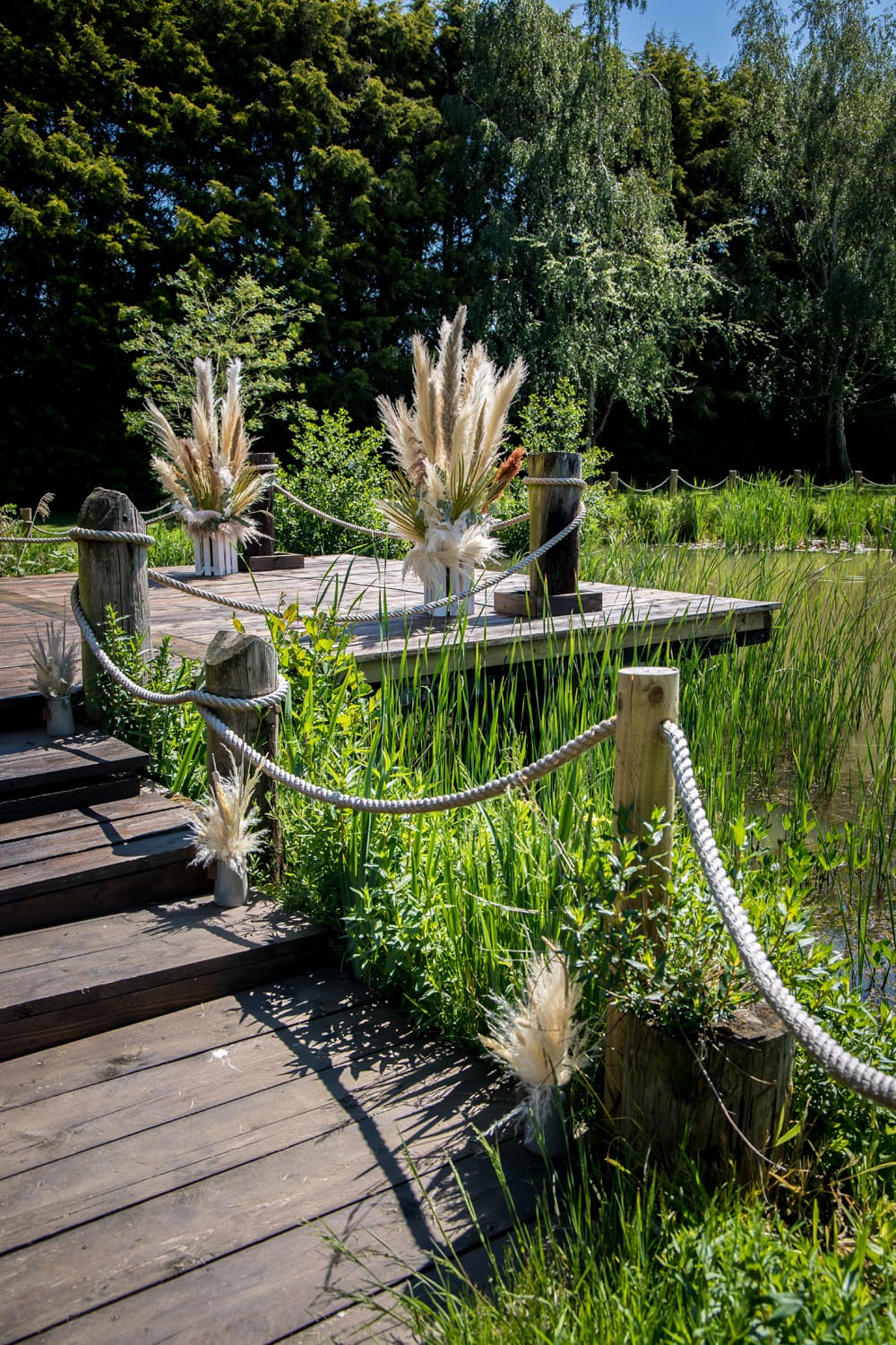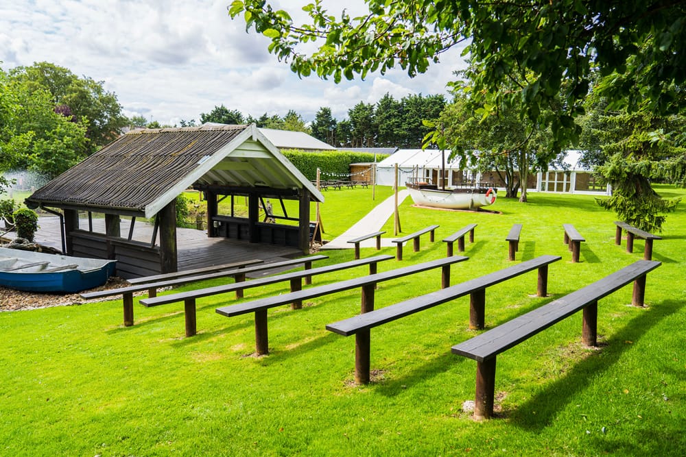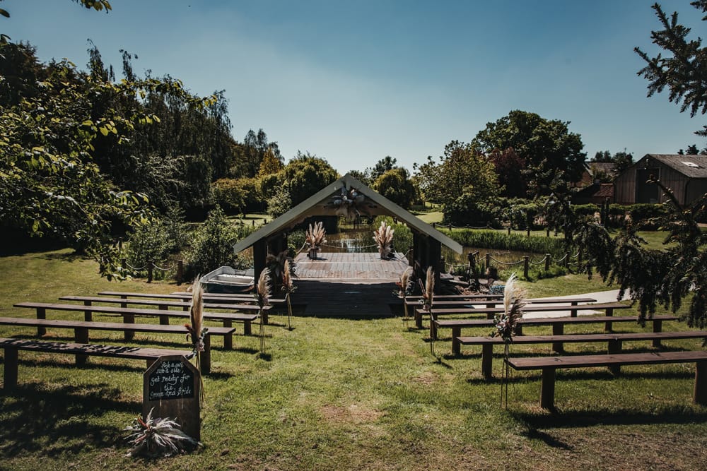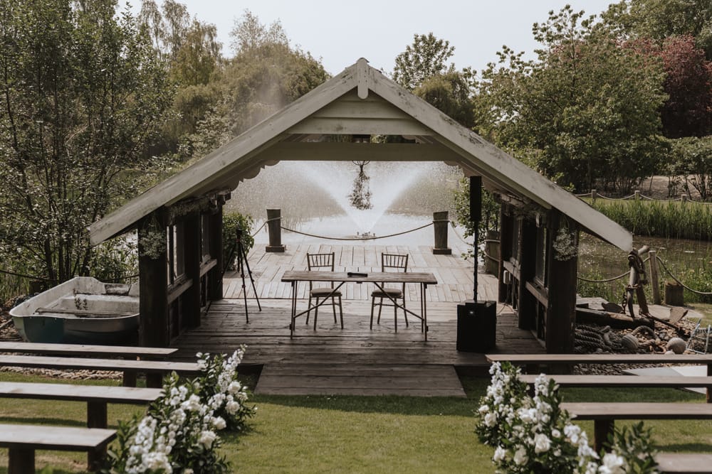 The venue offers outdoor and indoor ceremony spaces, each with unique charm. Outdoor ceremonies take place in the characterful lakeside boathouse, with guests seated on rustic tiered seating overlooking the water. The spacious luxury marquee provides an elegant alternative for indoor ceremonies, featuring panoramic windows, a faux barn back drop and climate control to ensure comfort in any weather.