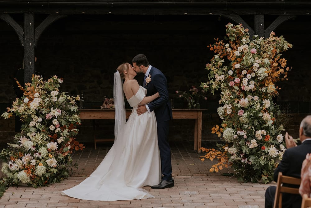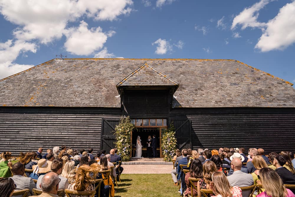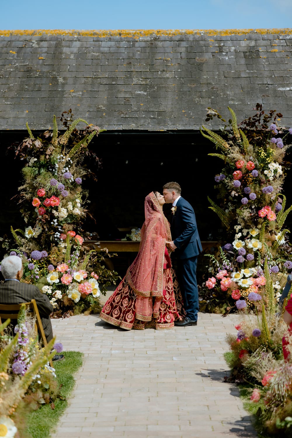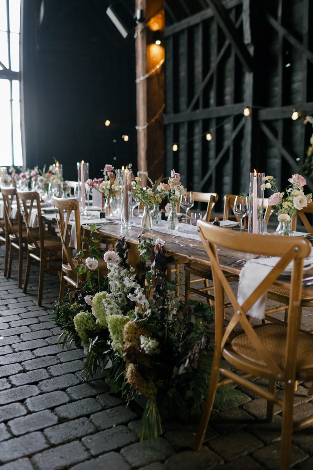 The reception spaces at Kingshill Barn are as versatile as they are beautiful. In addition to the stunning barn, the grass courtyard, encircled by wildflowers and festoon lights, is perfect for mingling, lawn games, or evening festivities under the stars. Late-night gatherings can take place in The Linhay, where the cosy wood burner keeps the atmosphere warm and inviting.