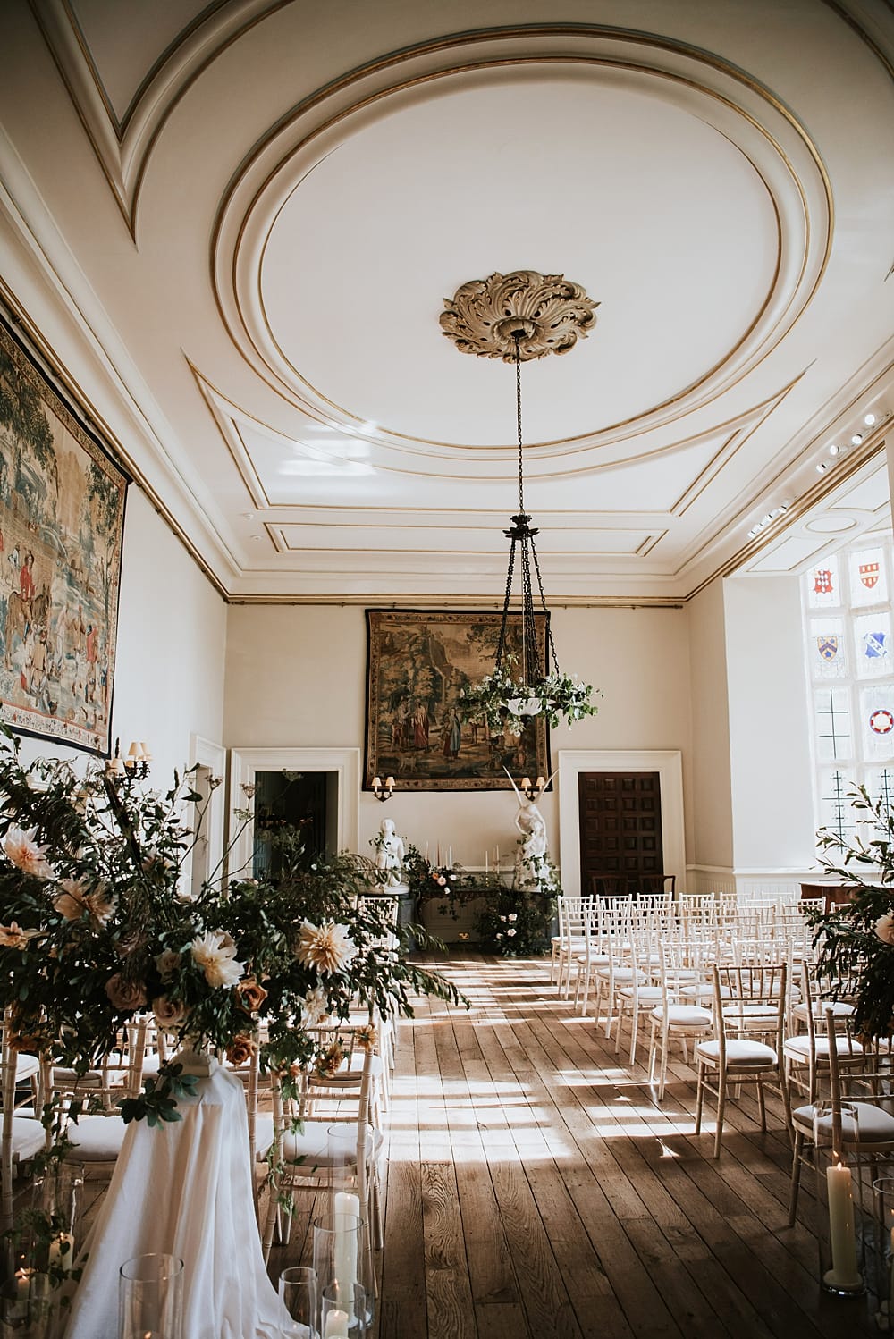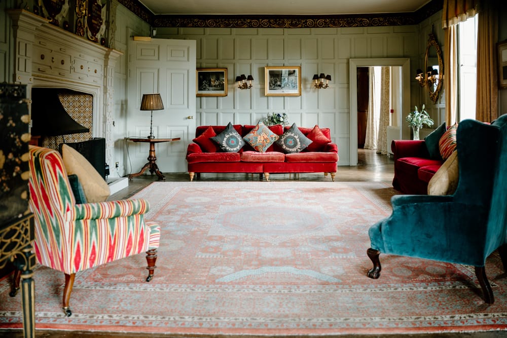 The main house has four stunning ceremony and reception areas. The primary one is the Hall, the heart of the house and an ideal location for a ceremony for up to 150 seated (and 50 standing) guests. The Drawing Room, The Morning Room, and The Porch (the house’s front steps are useable for an outdoor ceremony) make up the other three licensed ceremony areas.