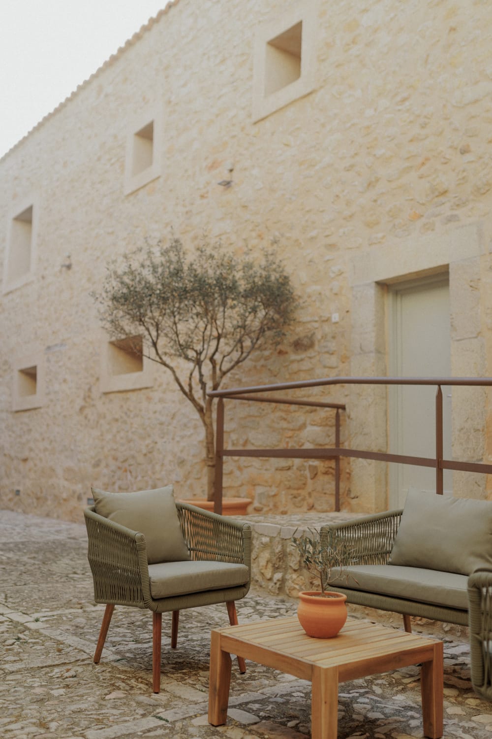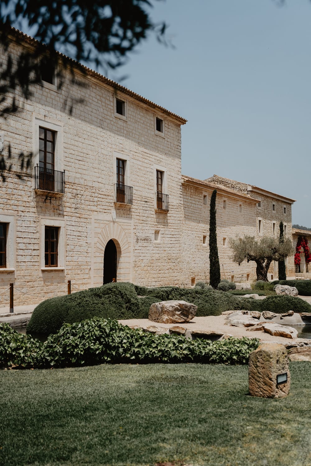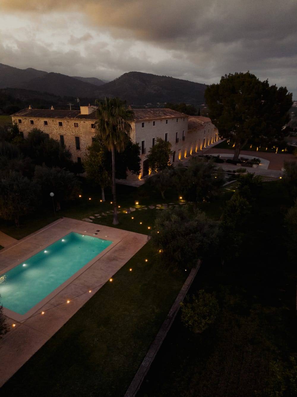 The estate lies in Binissalem, a wine-growing area in the island’s heart. It’s around half an hour by car from Palma, and only 20 km from Mallorca’s airport, so guests can arrive quickly yet still feel tucked away in the countryside.