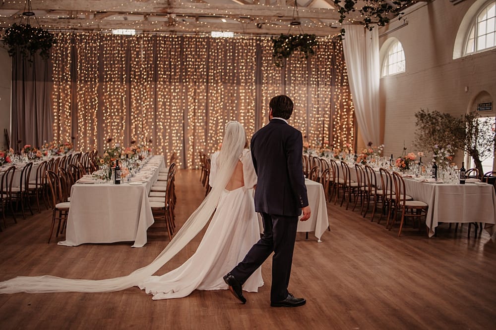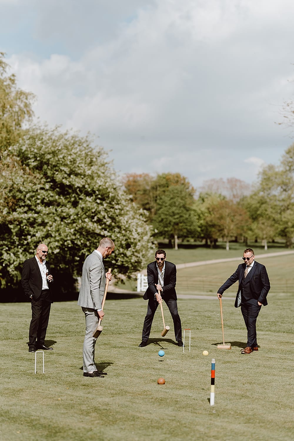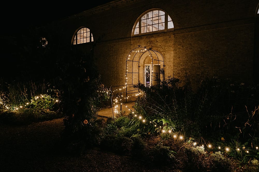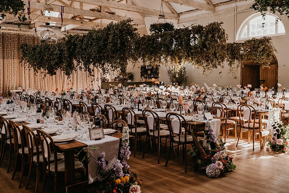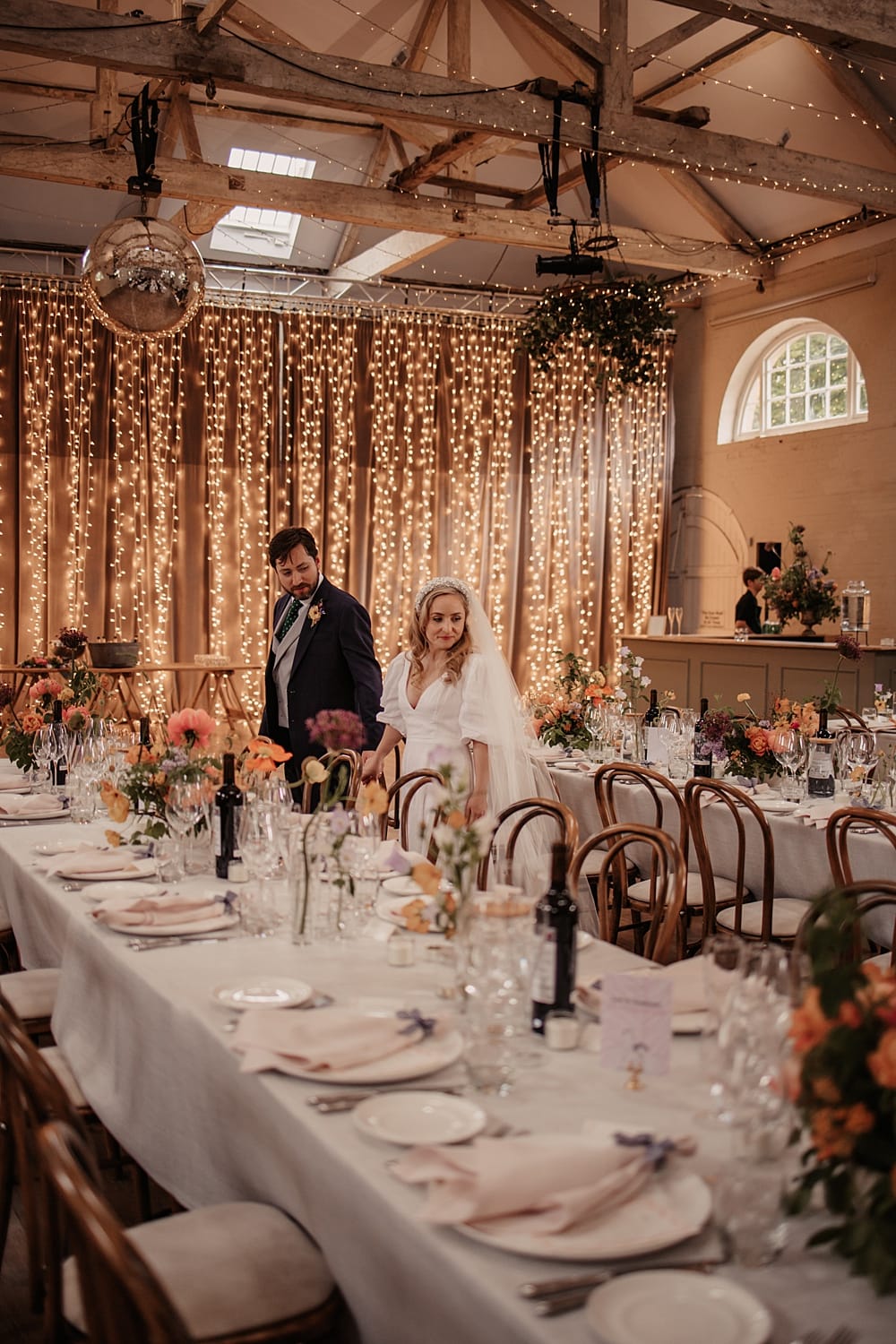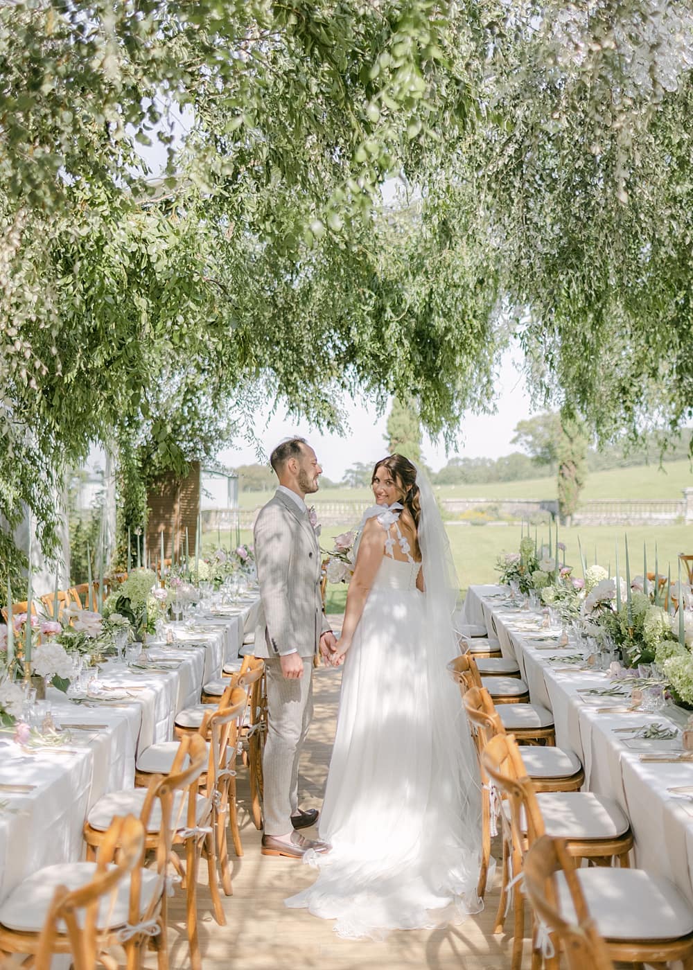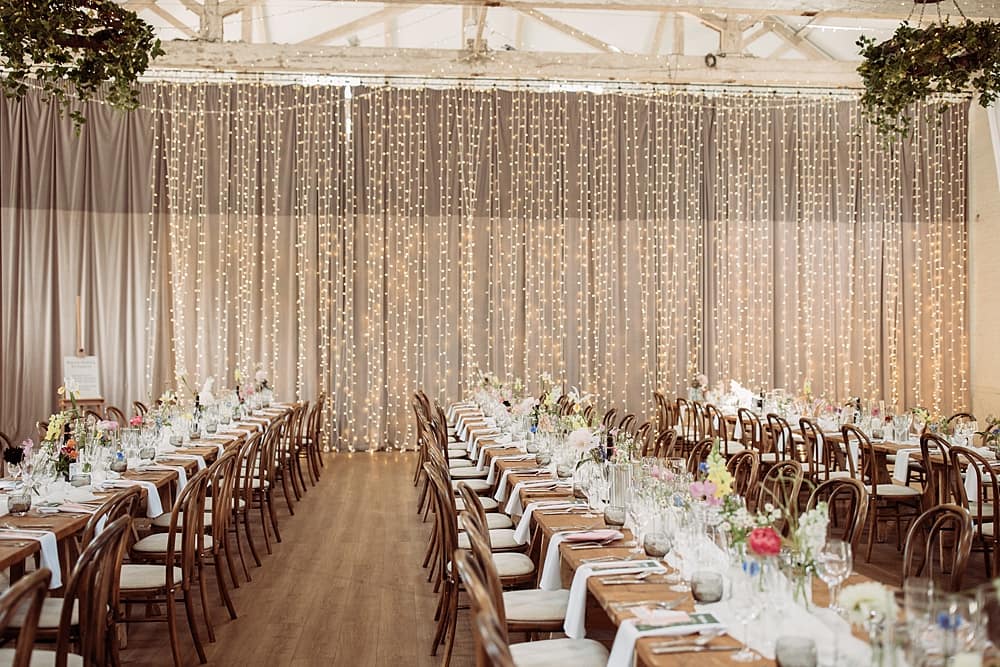 For the wedding reception, the Georgian Riding School and Croquet Lawns, a majestic, listed building, and adjacent grounds are a wonderful space that has it all. It features a spectacular fairy-lit ceiling with exposed oak beams, cascading fairy-light wall, soft white drapes, bar structure and blackboard, expansive grounds and croquet lawn, and a quintessentially English lakeside setting. There is also a bohemian-feeling 18th-century herb garden and orchard, which is perfect for drinks and photographs.