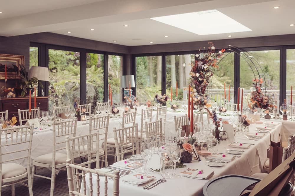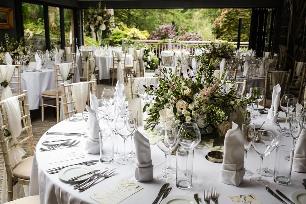 Enjoy your wedding breakfast in the sophisticated surroundings of the conservatory; this room can comfortably seat up to 60 guests, with additional room for guests to chat and mingle on the terrace with beautiful views.