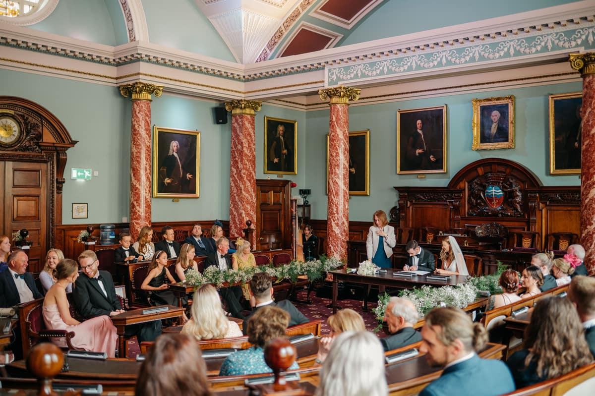 You have a choice of two ceremony rooms: the Council Chamber, with its dramatic dark wood, fixed seating, and marble columns, or the classically beautiful Brunswick Room, which offers plenty of scope for customisation.