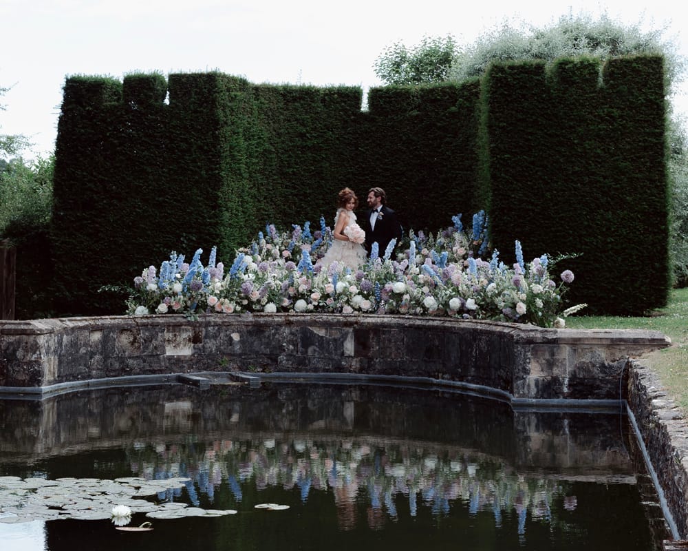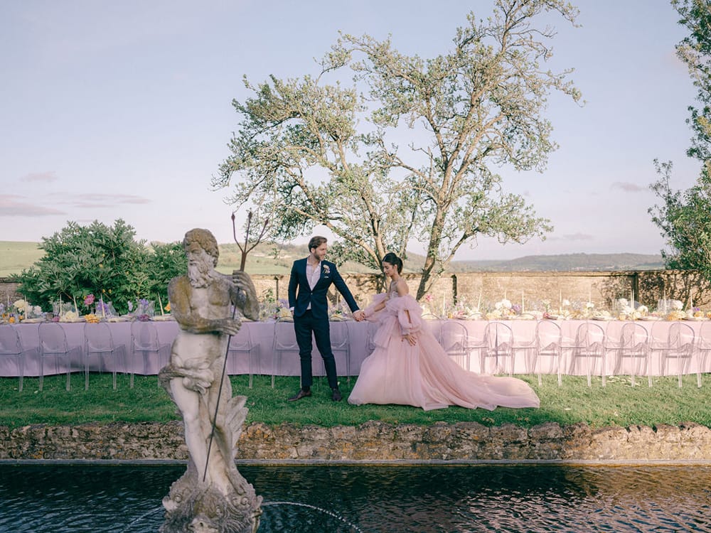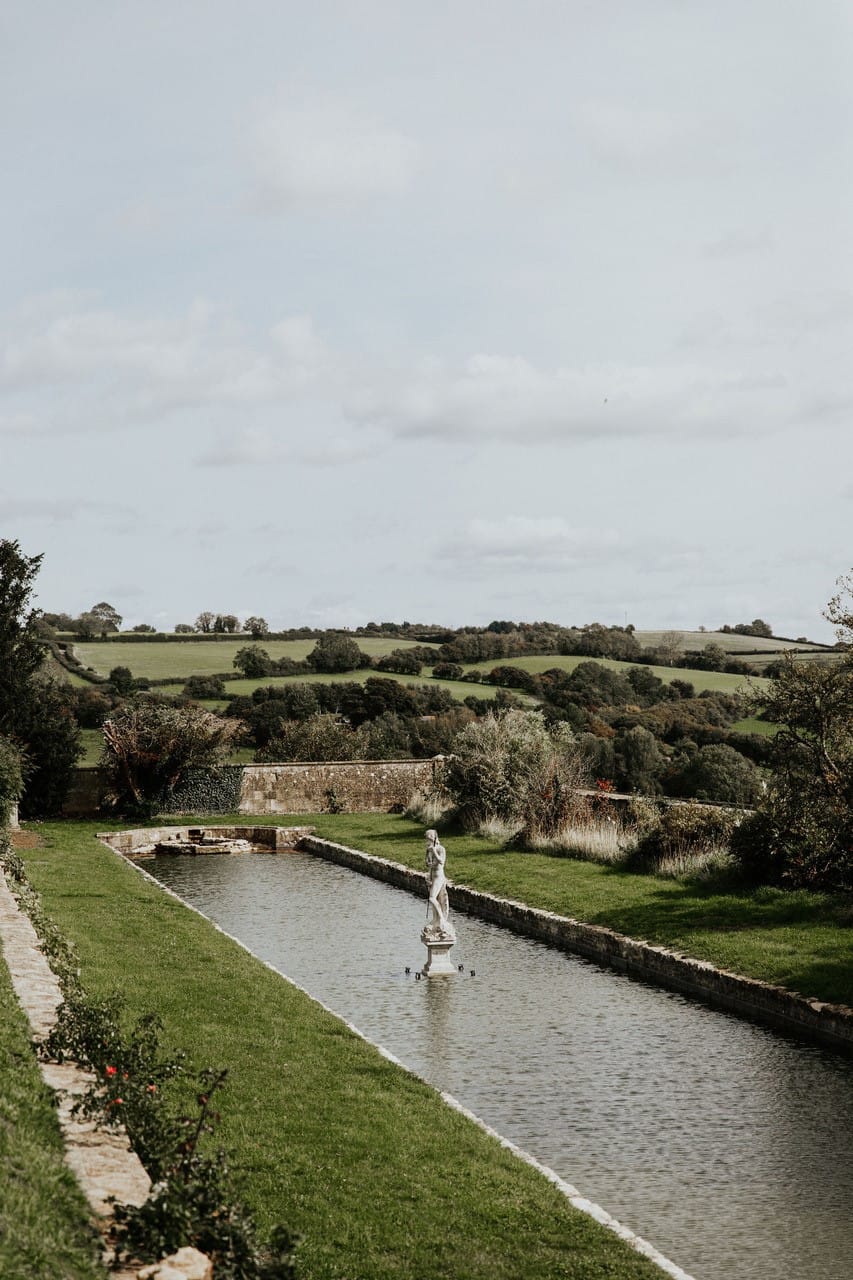 Following the ceremony, guests can enjoy a relaxed drinks reception on the terrace, which offers spectacular views over the Hamswell Valley with the Westbury white horse visible in the distance. Guests are also invited to explore the delightful walled gardens, the 18th-century water garden featuring a Neptune fountain and water lilies, the lover’s knot garden, and the pergola before heading to the marquee for the wedding breakfast.