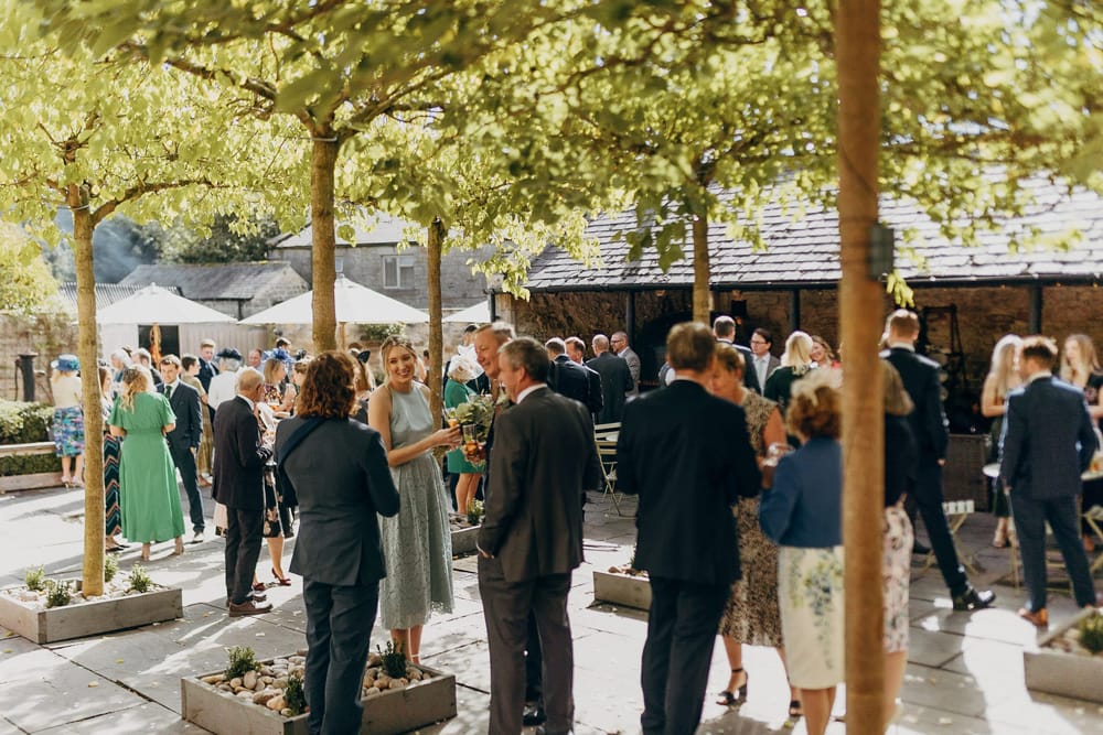 The courtyard is sheltered by buildings and is perfect for post-ceremony drinks on a mild day. It will be pretty magical at night, with fairy-lit trees, fire pits, and lanterns. There are two giant oak planters with seats around them, six umbrella-topped trees, two fire pits, various benches, cosy sun traps and planted troughs and borders. An open-sided building with garden furniture provides a covered outside area and a smokers’ refuge.