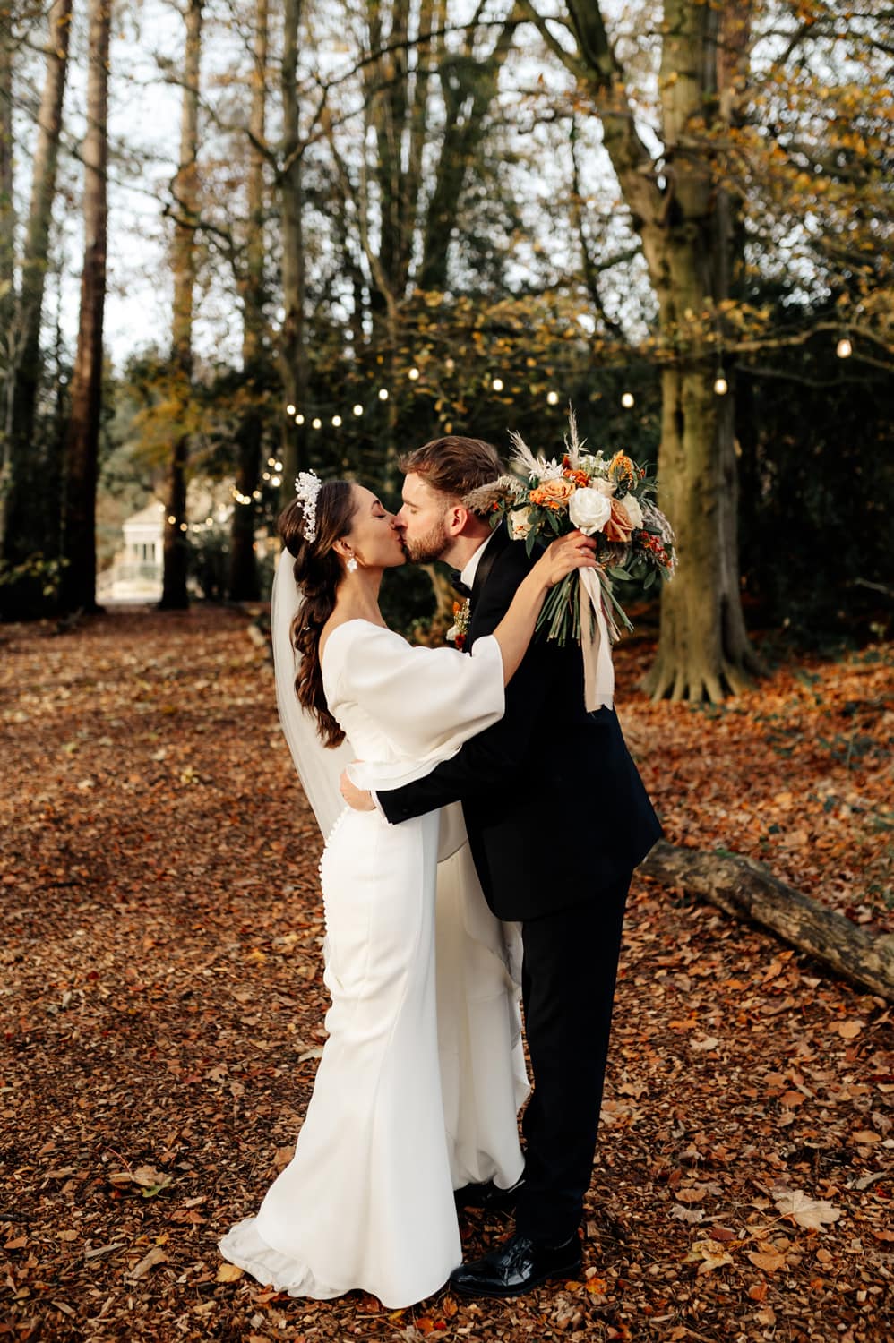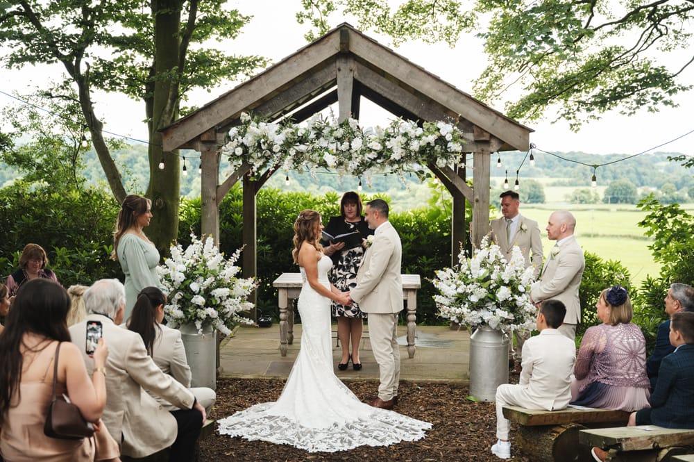 There are two ceremony locations at Hobbit Hill, each offering its own atmosphere and charm. The Round Wood provides a candlelit outdoor setting surrounded by trees, with rustic tree-trunk benches for up to 130 guests and gentle lighting threaded through the woodland. An oak pergola frames the vows beneath the open sky.
