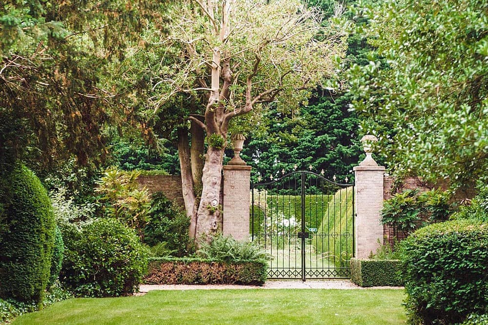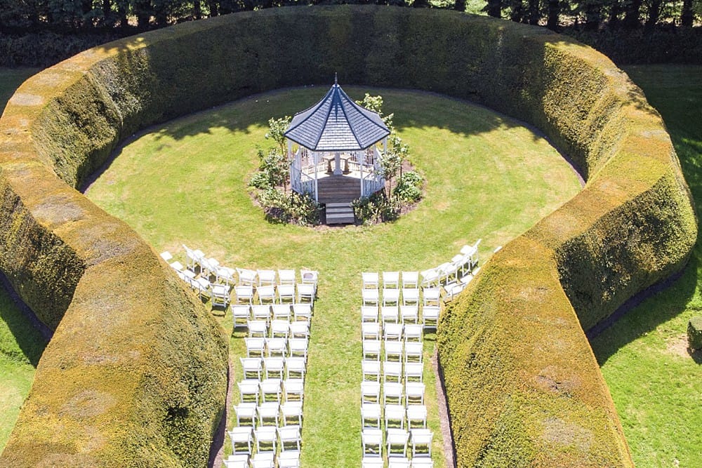 Couples may exchange vows either outdoors or indoors, and both settings offer distinctive charm. The outdoor ceremony space features a quaint covered gazebo, approached via an aisle framed by historic, manicured hedges. Indoors, the ceremony room is bathed in natural light, providing a bright and elegant setting for the occasion.