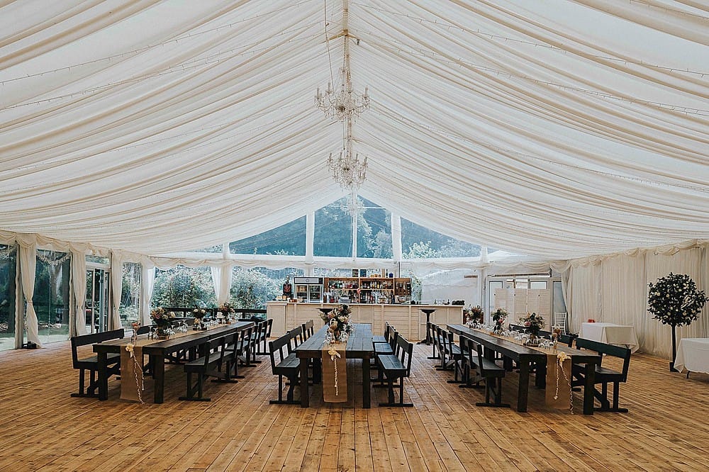 The grand marquee offers a spacious and light-filled setting for your wedding reception. It is within five acres of landscaped gardens and can accommodate up to 280 guests. A permanent bar and a dedicated dance floor annexe ensure a seamless transition from dining to evening festivities.