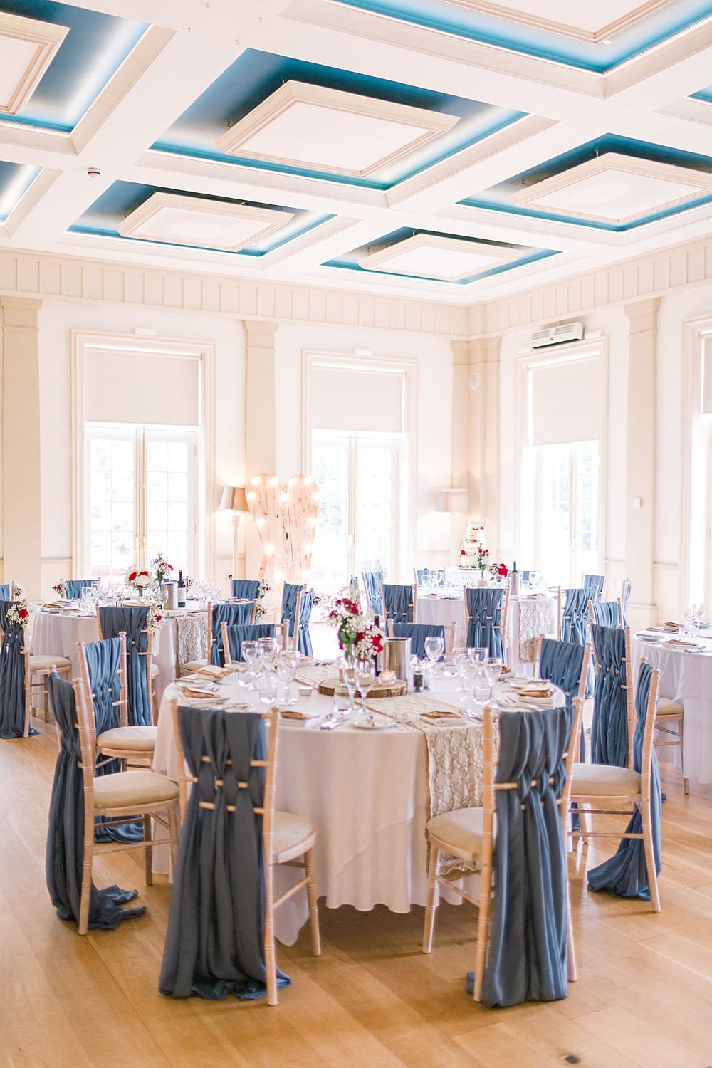 Ceremonies take place in a variety of elegant spaces. The Panelled Hall, with its family portraits and richly patterned walls, hosts both traditional and informal ceremonies in a setting full of character. Buchanan Hall, newly refurbished and filled with natural light, provides a modern alternative, with tall windows framing the grounds. The Library and Ante-Room offer quieter, more personal options, while an outdoor ceremony area is also available following its recent renovation.