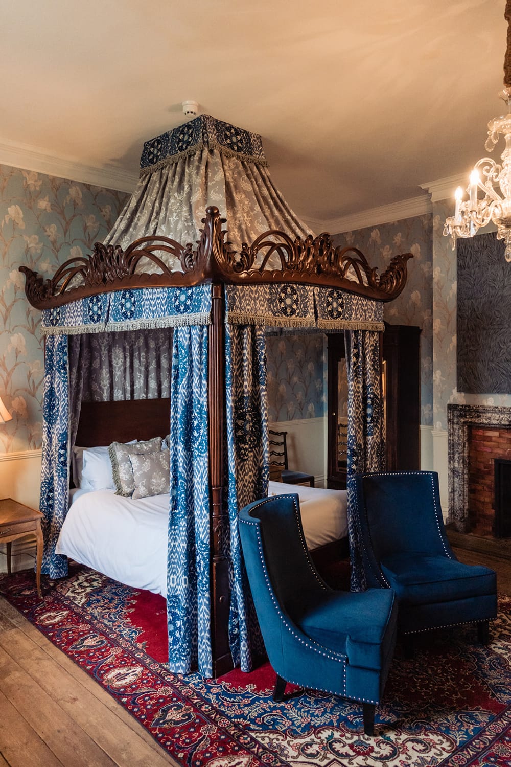 With 42 uniquely styled bedrooms accommodating up to 100 guests, Huntsham Court is exceptionally well suited to weekend-long weddings. The rooms blend period detail with comfort – four-poster and canopy beds, antique bathtubs, timber beams, chandeliers, and vibrant fabrics.