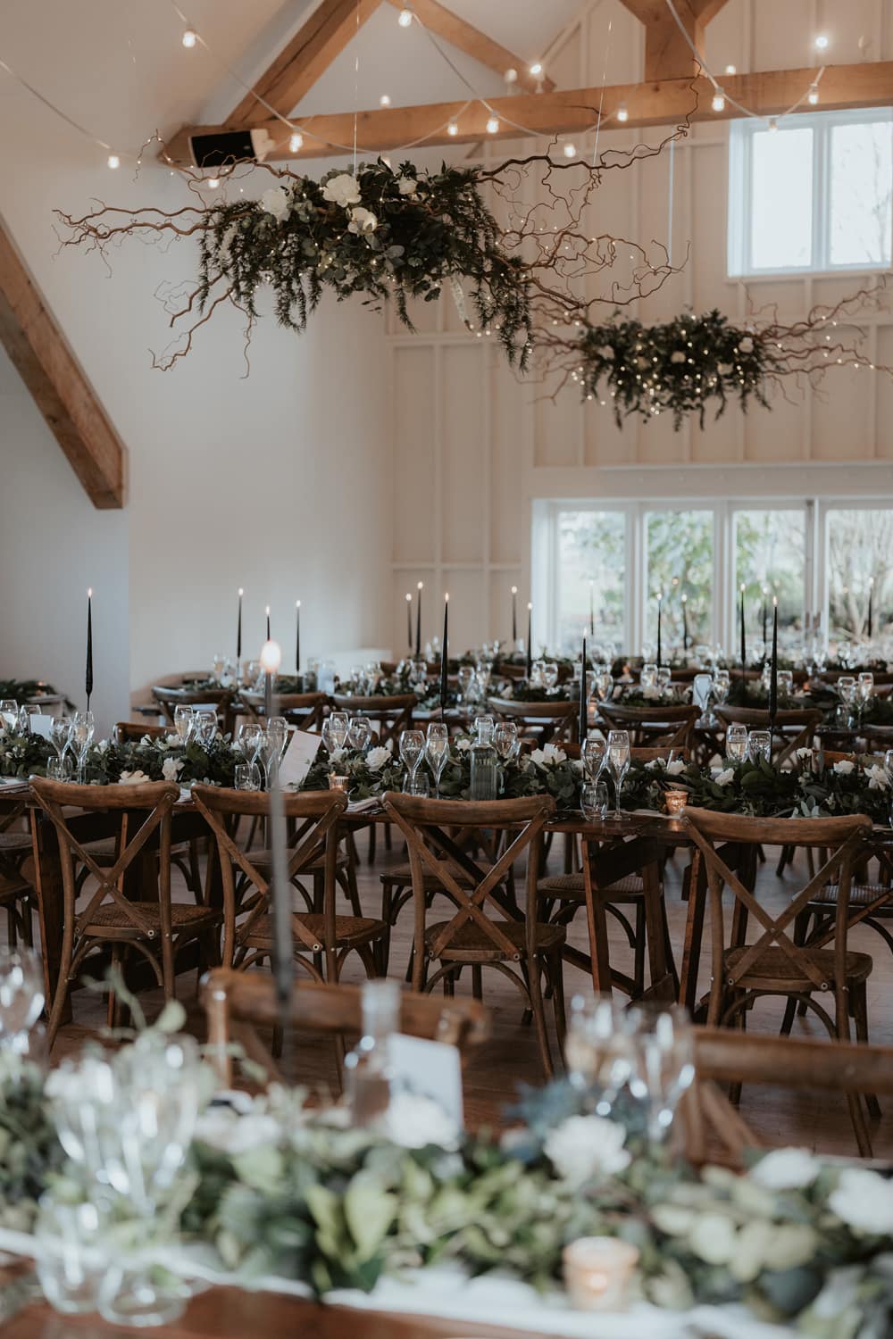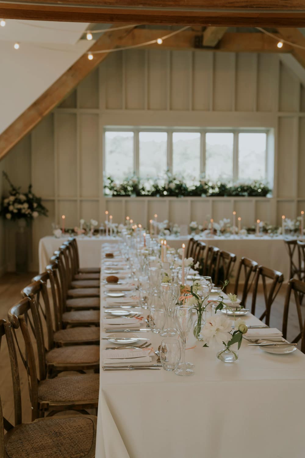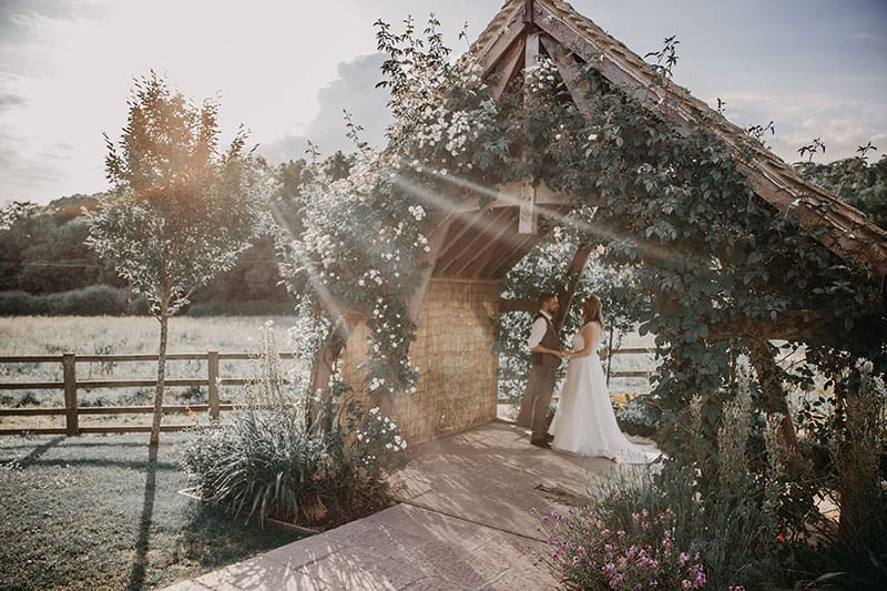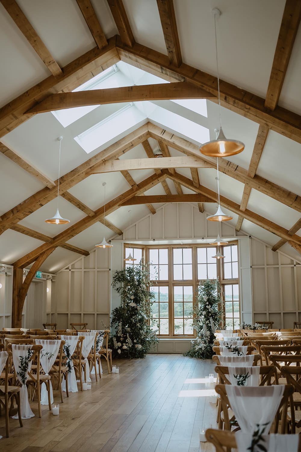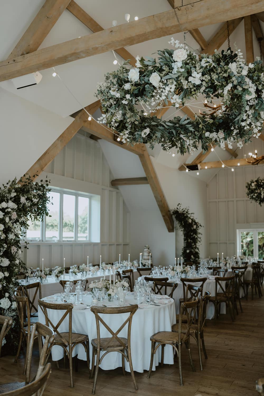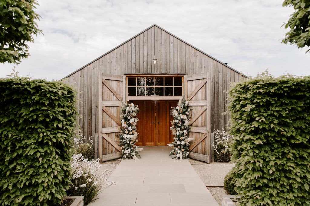 Following the ceremony, guests are welcomed into Hyde Barn for the wedding breakfast. The dining hall, with its vaulted oak beams, offers a blank canvas that can be tailored to suit each couple’s vision. In addition to the dining area, there is a comfortable lounge bar, a spacious get-ready suite, and a cosy upstairs lounge. Outside, guests can enjoy beautifully kept gardens with panoramic countryside views.