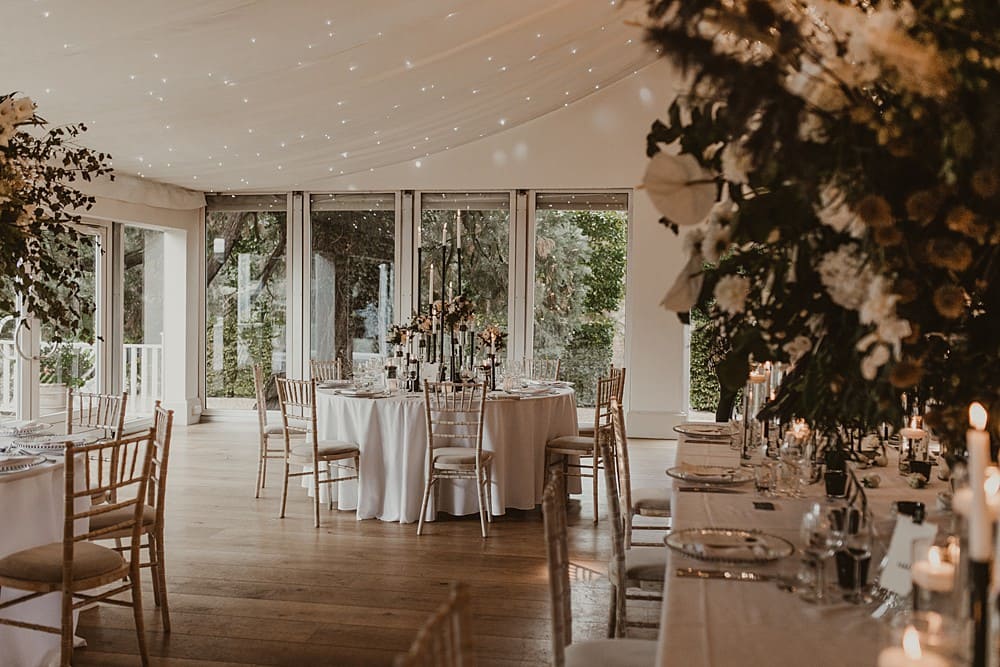 The Garden Room, filled with natural light and offering stunning views of the garden, provides a serene atmosphere. Attached to the Garden Room is a beautiful marquee, ideal for hosting a seated wedding breakfast for up to 160 guests.