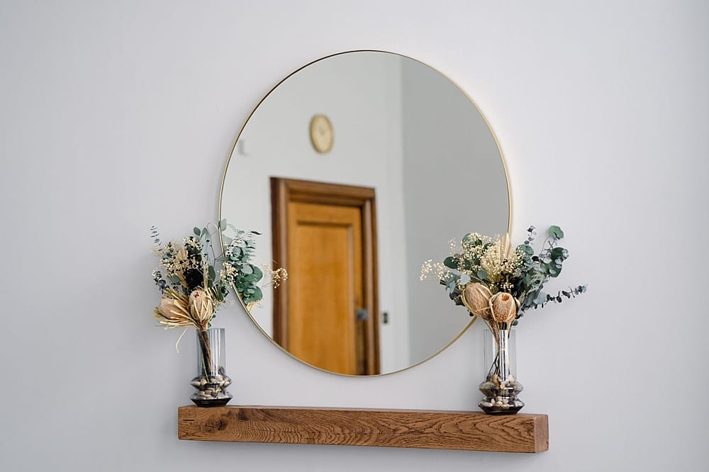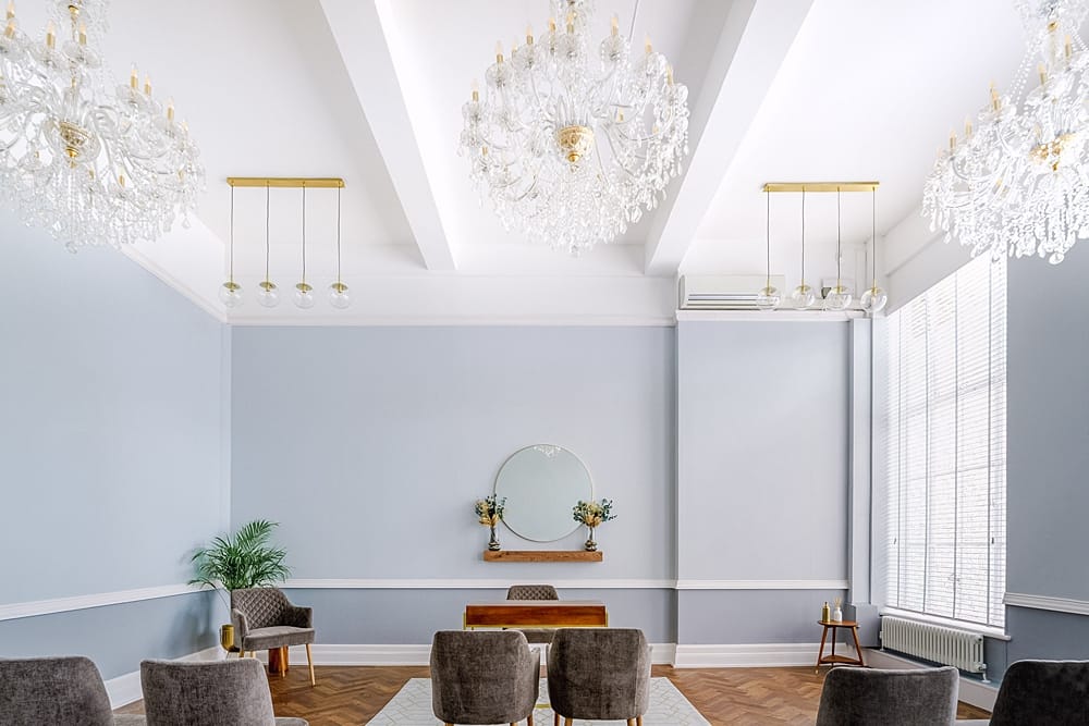 With a mid-century feel and tasteful simplicity in oak, grey, and white, this room features parquet floors and a beautiful oak mantelpiece with a circular mirror as a focal point. Large windows provide ample natural light, and with three Italian chandeliers and comfortable velvet chairs, Room 99 provides a popular and chic setting for your ceremony.