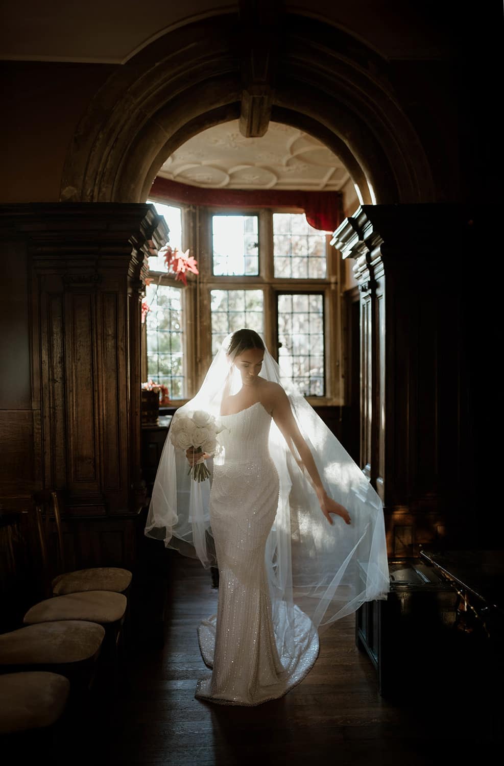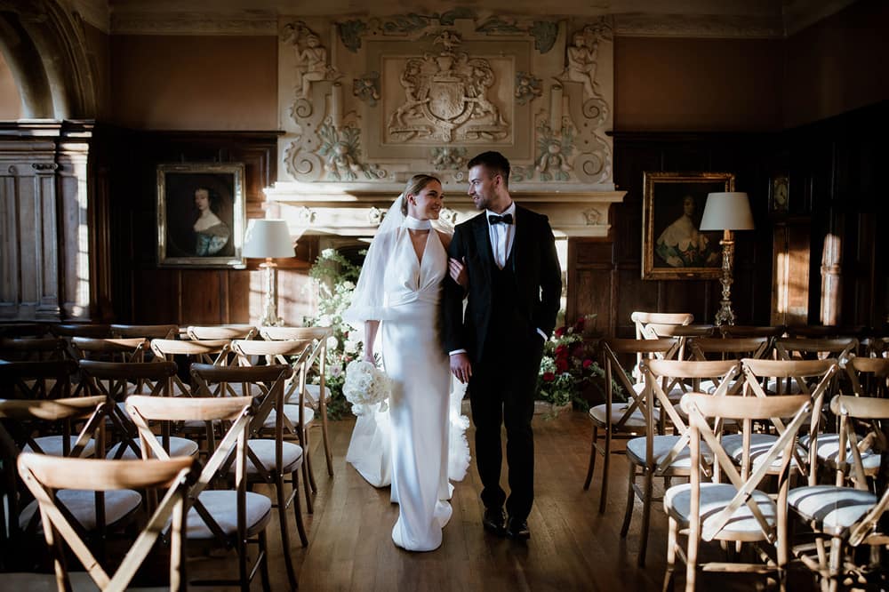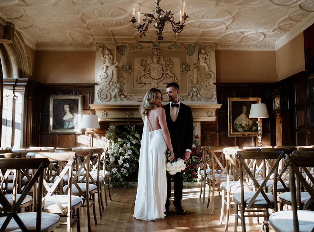 A majestic indoor setting with an Arts and Crafts plaster ceiling, impressive overmantel, and intricate wood panelling. Perfect for intimate ceremonies.