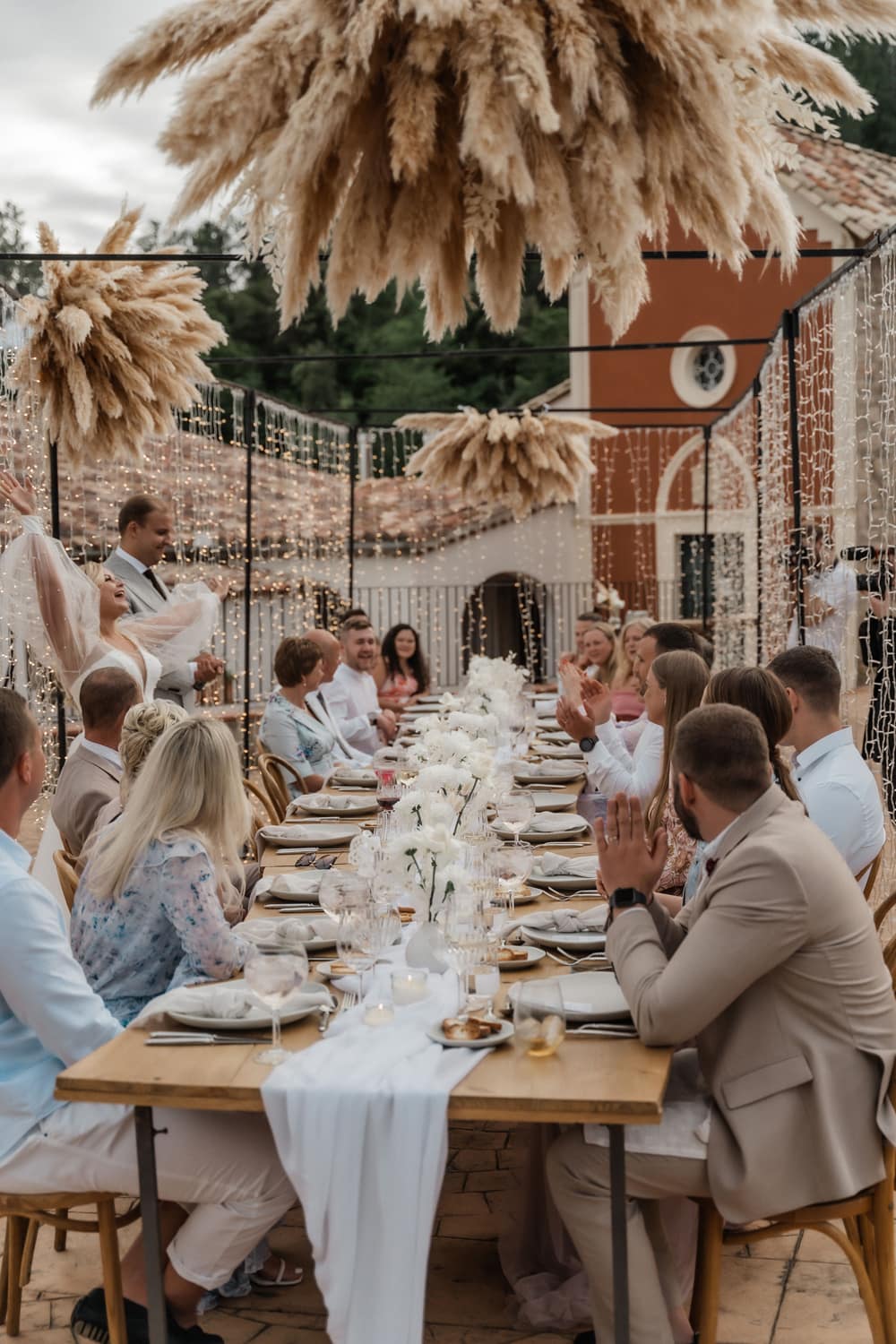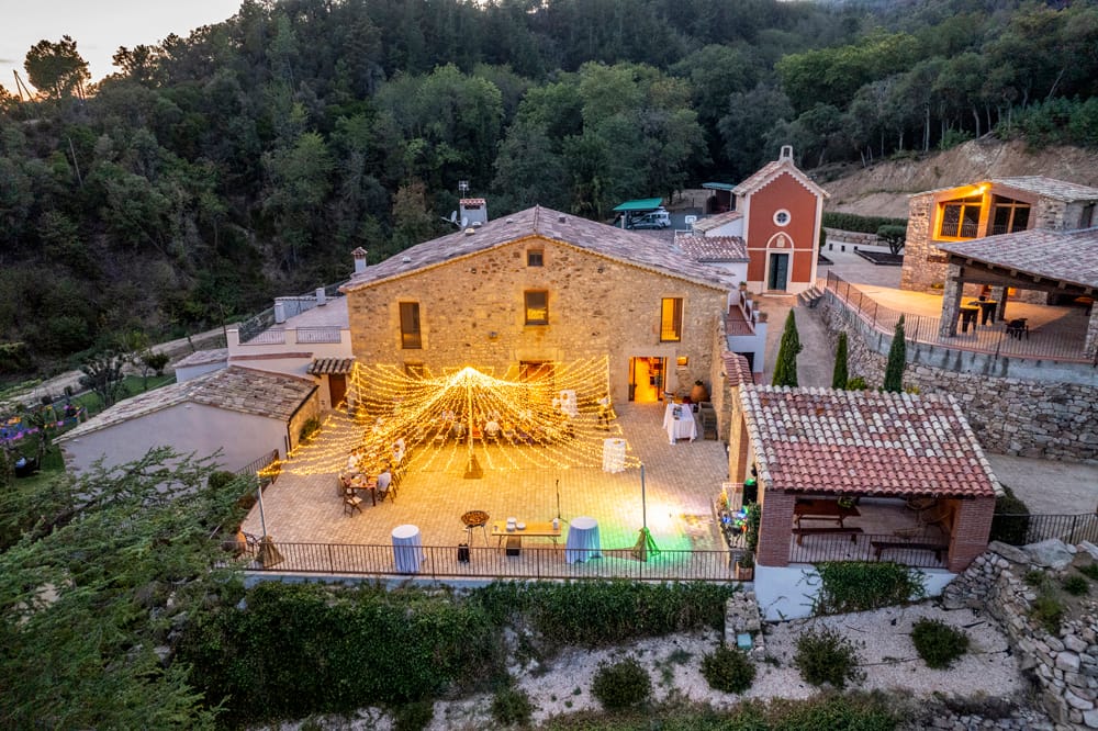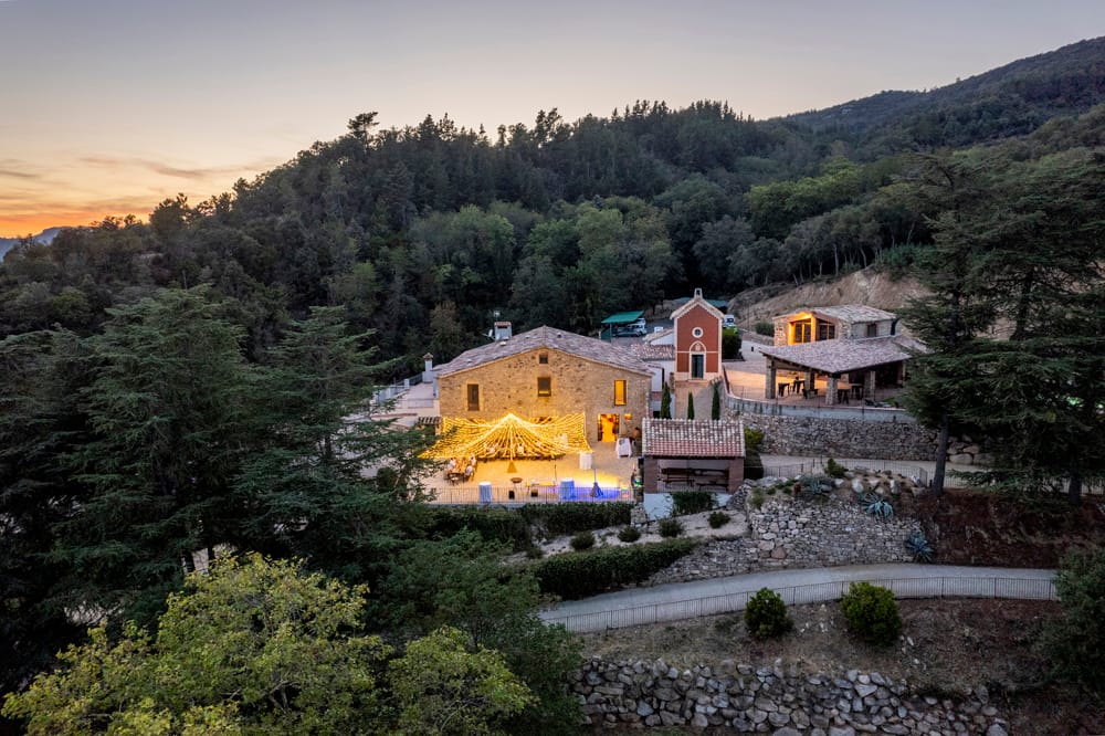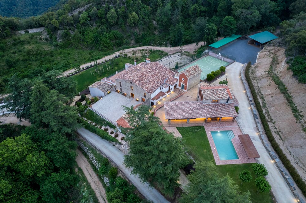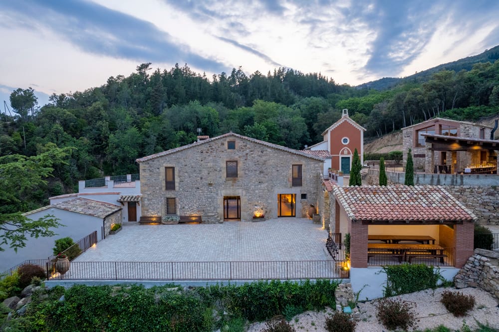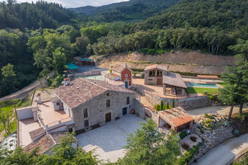 Mas Huix, ideal for intimate gatherings of up to 40 guests, offers a secluded retreat surrounded by forests and mountains. This 11th-century farmhouse provides an inviting setting with expansive gardens and courtyards creating a peaceful atmosphere, with panoramic views as a breathtaking backdrop. A swimming pool, a 100-meter porch, and beautifully landscaped grounds add to the experience.