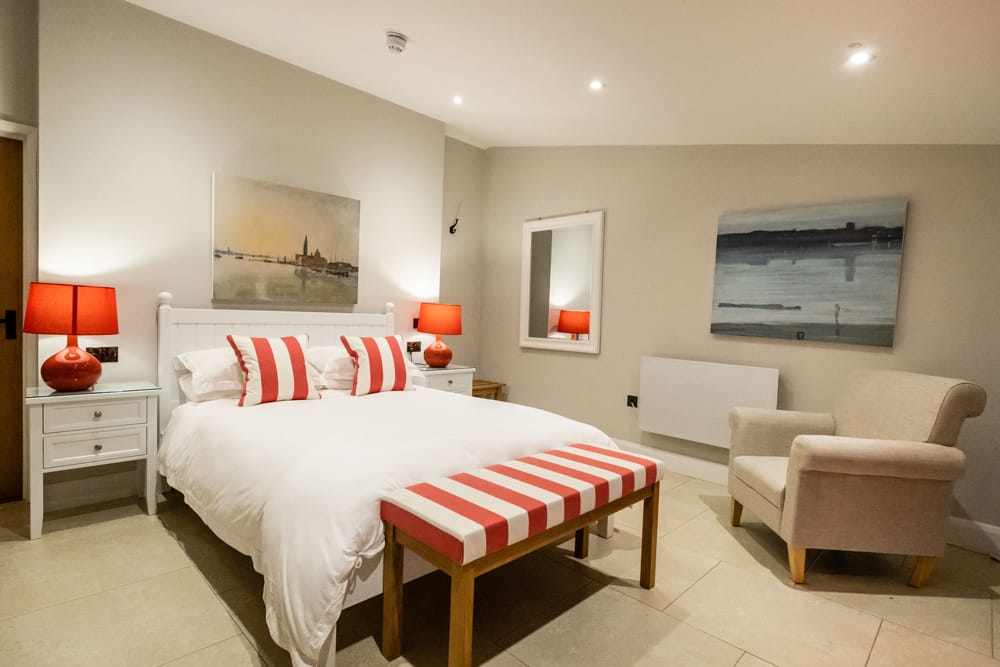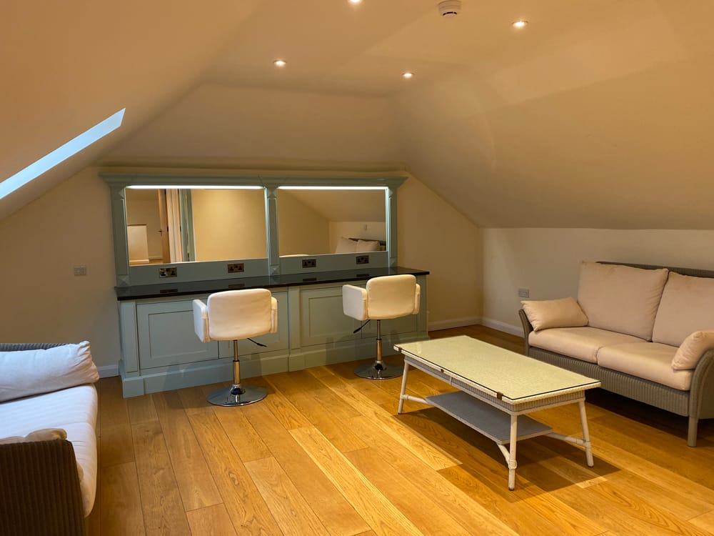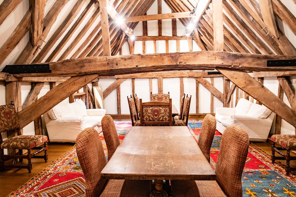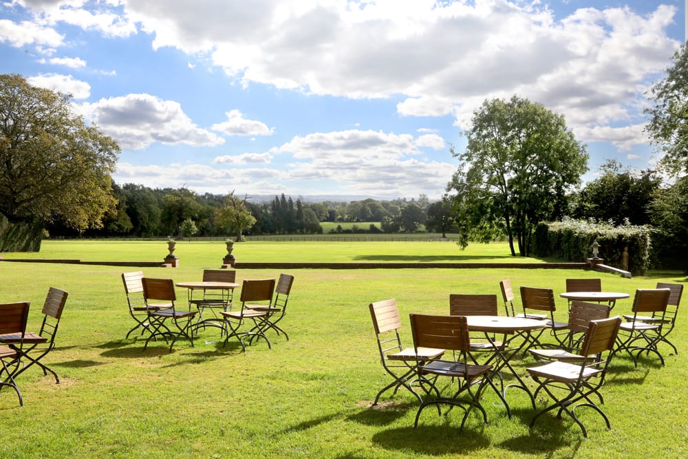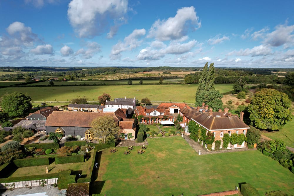 Micklefield Hall sits within a private 350-acre working farm in the Hertfordshire countryside. There’s a pond, sweeping lawns, and a 450-year-old oak tree that adds a sense of history to the grounds. The gardens include herbaceous borders, a French terrace, and a rose garden; plenty of space for guests to explore or relax throughout the day.