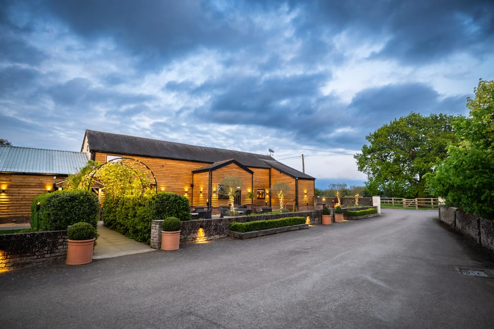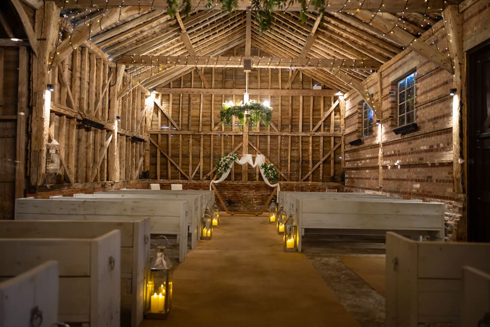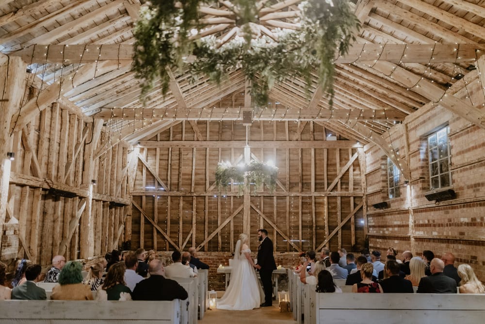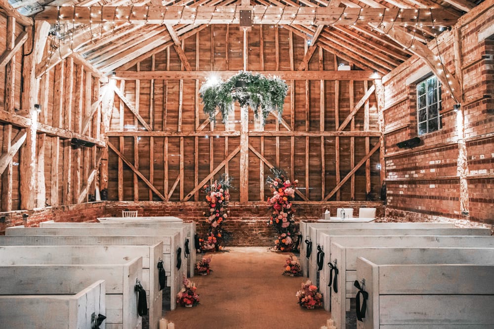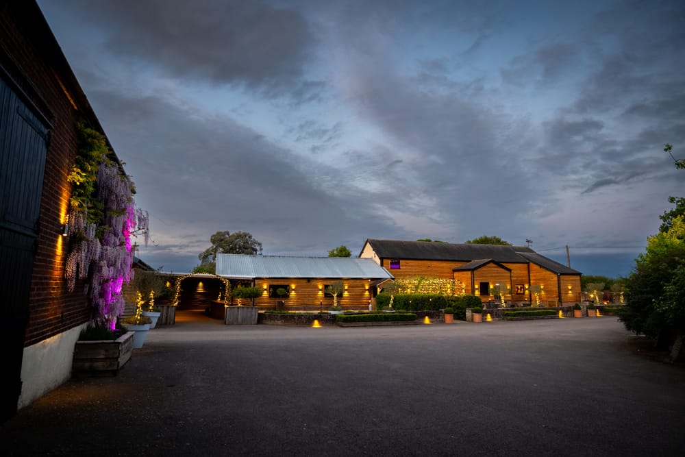 Couples can exchange vows in the Oak Barn, a stunning ceremony space full of original features, atmospheric lighting, and timeless rustic charm. Its wooden beams, high vaulted ceiling, and natural textures create a romantic and intimate setting. The ceremony space flows seamlessly into the surrounding barns and outdoor areas, allowing the day to unfold naturally from one moment to the next.