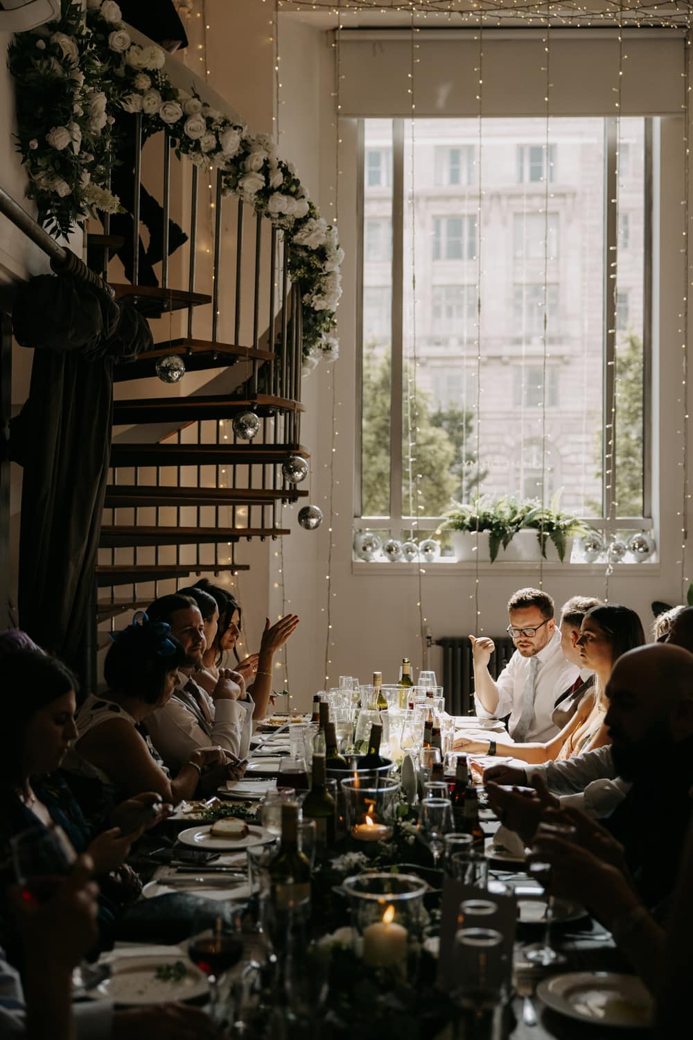 OH ME OH MY occupies West Africa House in Liverpool’s historic downtown, a short stroll from the River Mersey. Built in the 1920s by Briggs, Wolstenholme and Thorley, the building was once home to the prestigious Bank of West Africa. From its roof garden, Goodness Gracious, couples can take in one of the city’s finest views, with the Liver Building just a stone’s throw away. The interior blends period character with contemporary style, offering a versatile space that suits both intimate and larger gatherings.