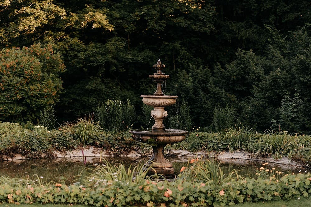 The unique Ostenwalde Orangery is surrounded by gardens and lush greenery, including a small fountain showcasing the venue’s historic elegance.