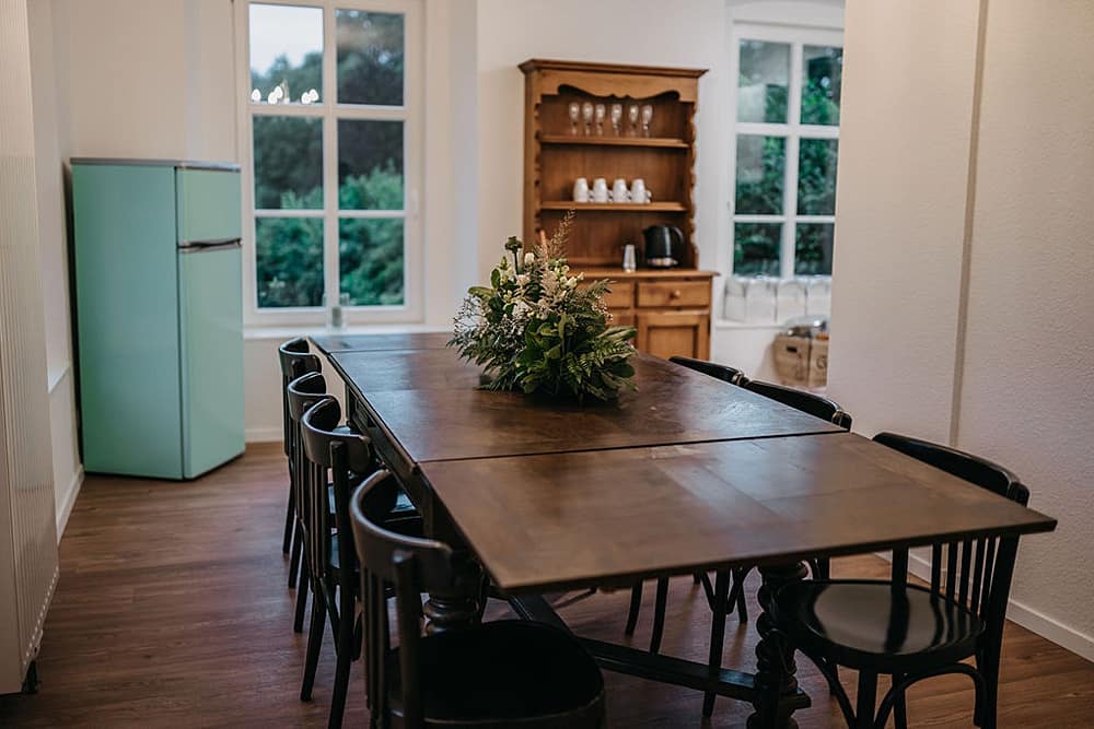 More than 20 years ago the orangery was built within the yard and once served as winter protection for exotic plants on the estate. It has since been transformed into a beautiful space for weddings and private events. Through the large south-facing window, the orangery shines brightly in the sunshine highlighting the character and charm of the old quarry stone wall.