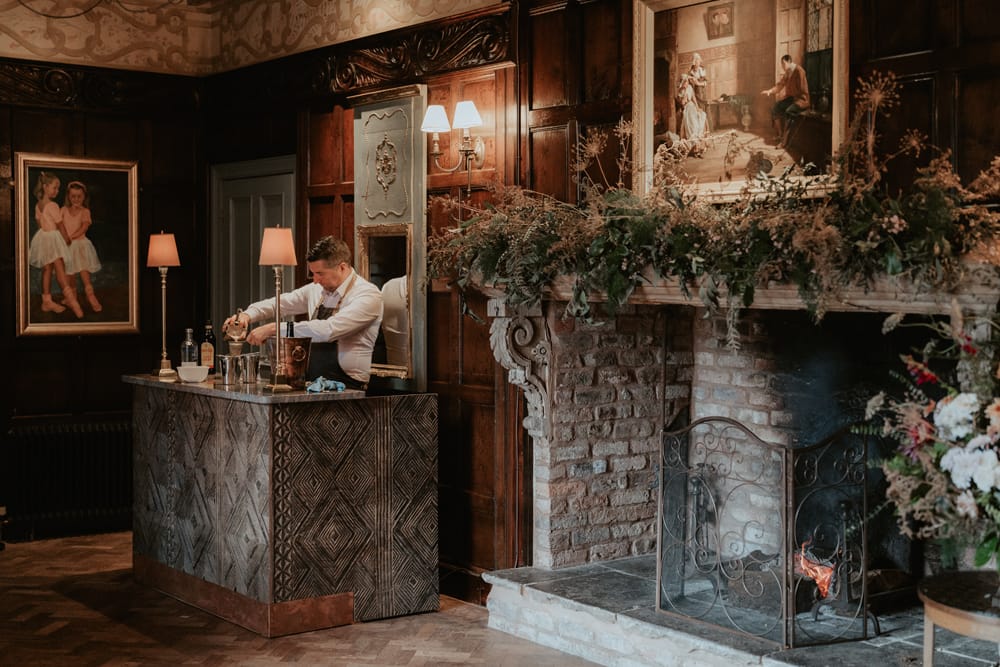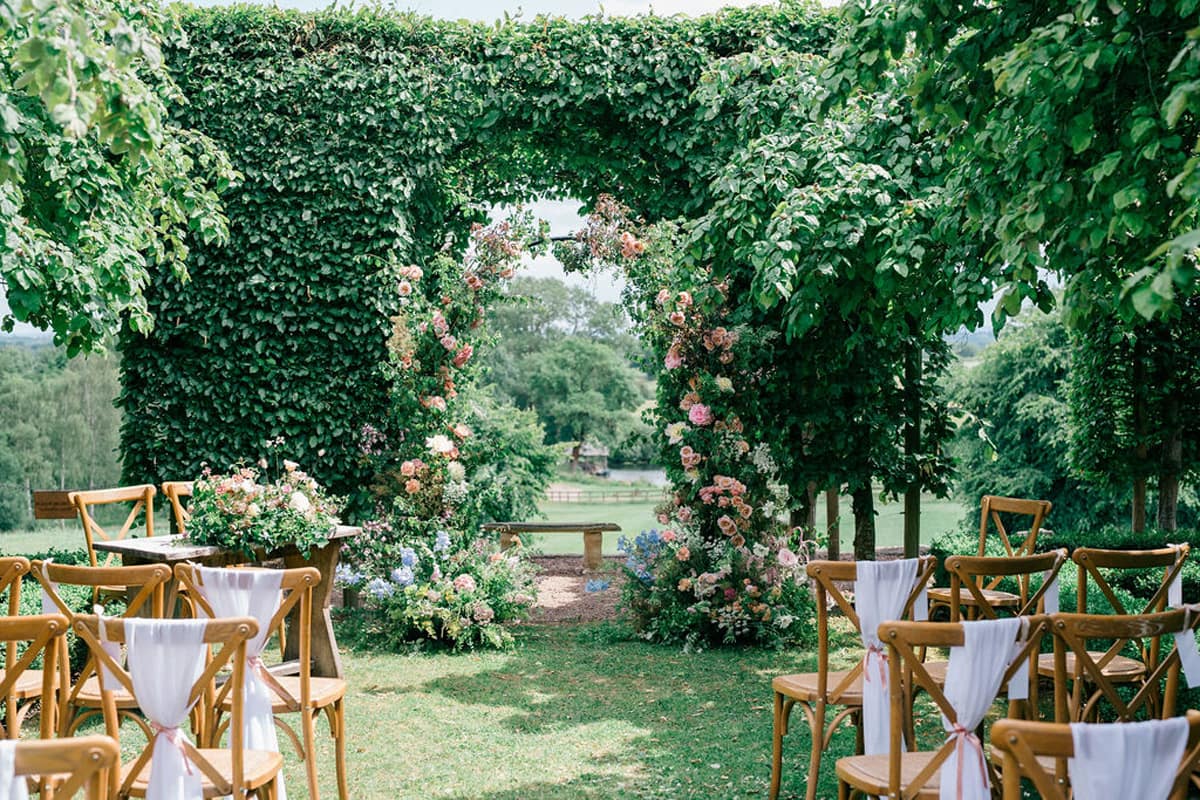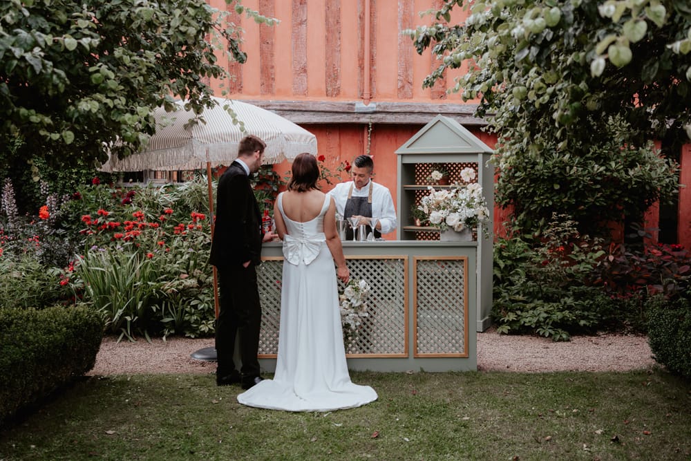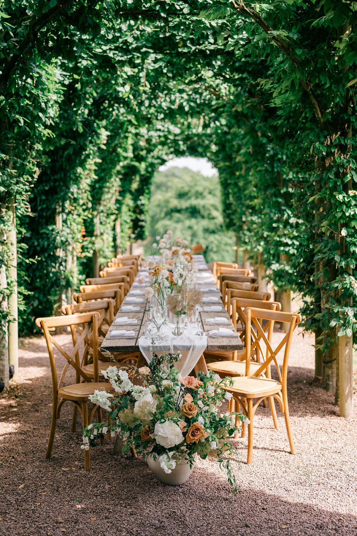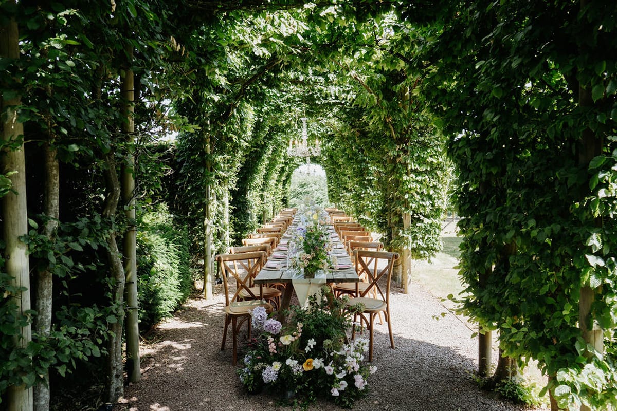 For dining, the hornbeam arches create a romantic setting with views of the Cornmill and lake. Should the weather change, the large stretch tent offers a sheltered alternative. As the evening progresses, guests can move indoors to the Panelled Room bar and the Ballroom, which provides a cosy space for music and dancing.