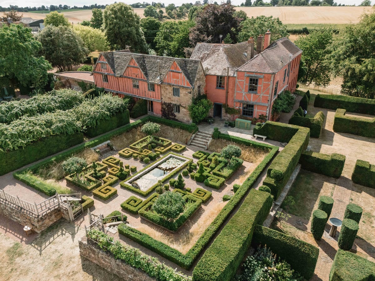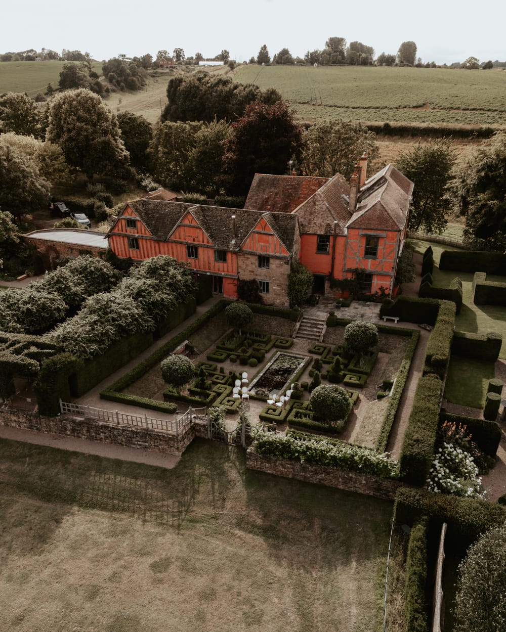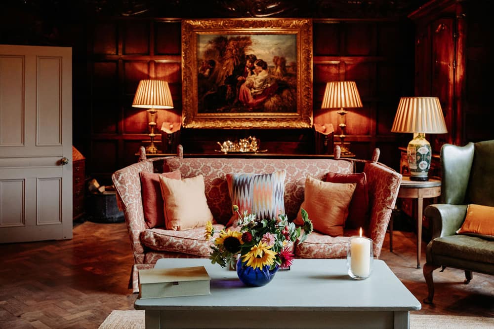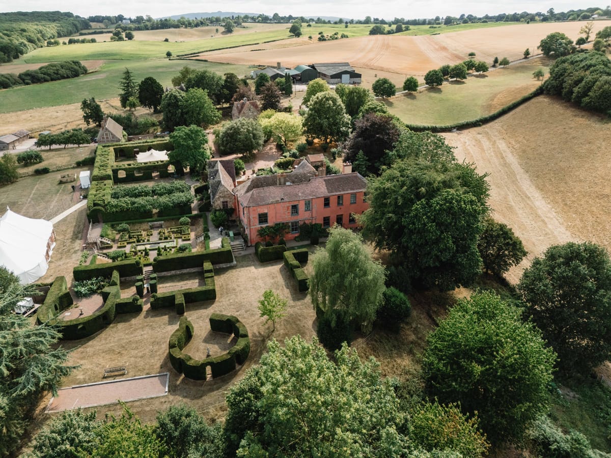This family home, painted in a striking pinkish-terracotta hue, evokes memories of Italian or French landscapes and provides an intimate yet grand location for a wedding weekend. Privacy, seclusion, and exclusivity are key features of this Gloucestershire gem, where the countryside surrounds guests in tranquil beauty.