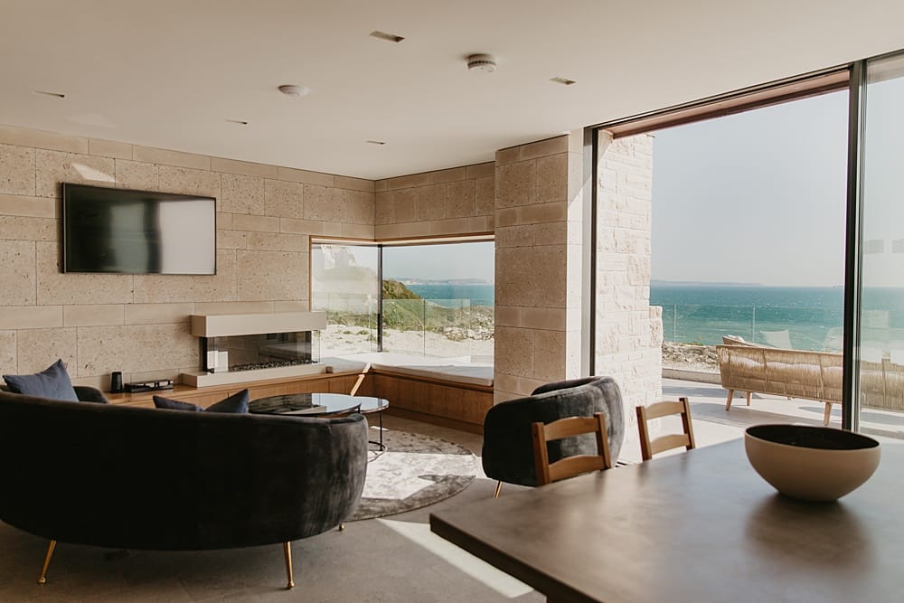 Pennsylvania Castle and Clifftops Lodges are available on a minimum two-night exclusive-use basis and can accommodate up to 40 guests. The Castle provides space for up to 20 guests in nine en-suite rooms, while Clifftops Lodges offer accommodation for an additional 20 guests across ten bedrooms in five luxury self-catering lodges. The Estate is also home to The Front Rows, a collection of cliffside caravans available for guests to book directly.
