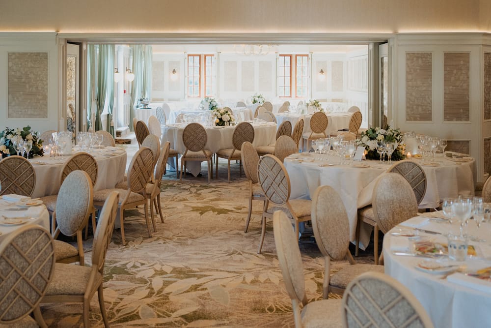 The Terrace wing at Pennyhill Park, newly refurbished with a classic design, is available exclusively for wedding receptions. It includes a private bar, balcony, and a breakout room for guests who want to take a break from the music.