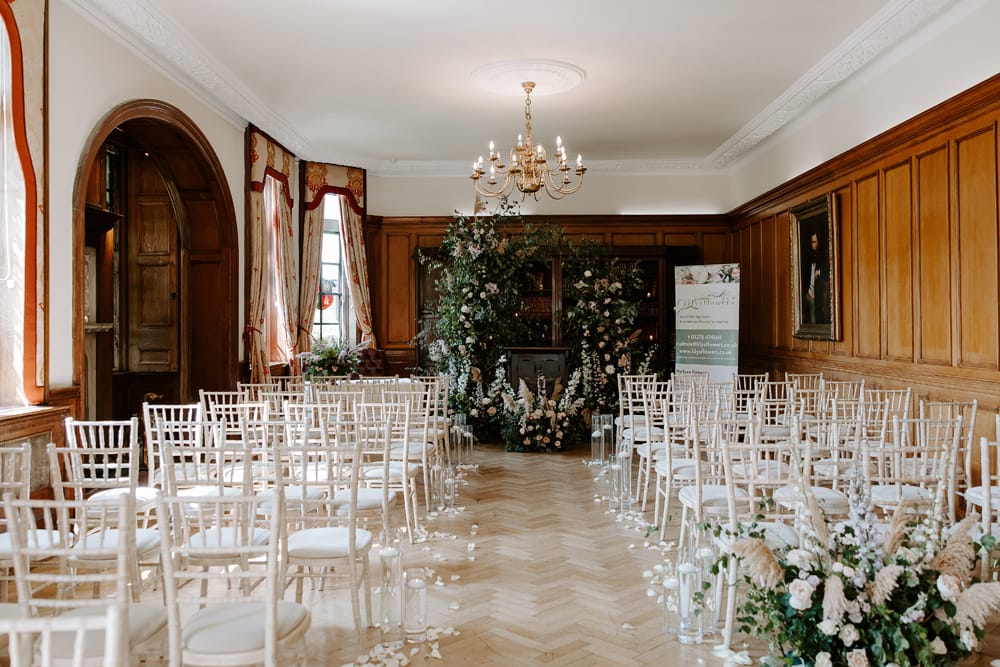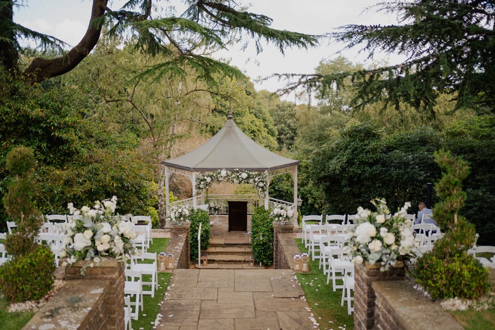 Pennyhill Park offers several options for wedding ceremonies, including the traditional Library, which is brimming with character and overlooks the Lily Pond terrace. There is also an outdoor pavilion where couples can exchange their vows amidst the beautiful surroundings.