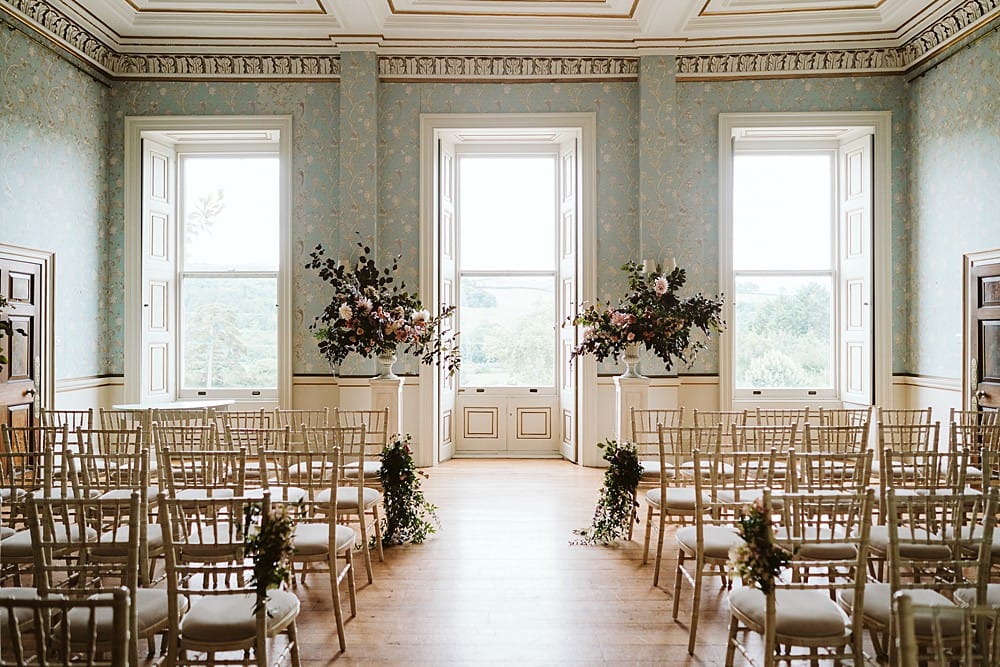 Outdoor weddings at Pynes House take place in the front courtyard, framed by fastigiate oak trees and the rolling Devon hills as a backdrop. Inside, choose from one of the grand State Rooms. The most popular is the Drawing Room, which offers a light-filled room overlooking the fountain and rose terrace. The Ballroom, with its historic chandeliers, might be chosen for larger weddings. Or consider the grand Entrance Hall, a majestic stone staircase and balcony which gives rise to a uniquely intimate but dramatic ceremony location.