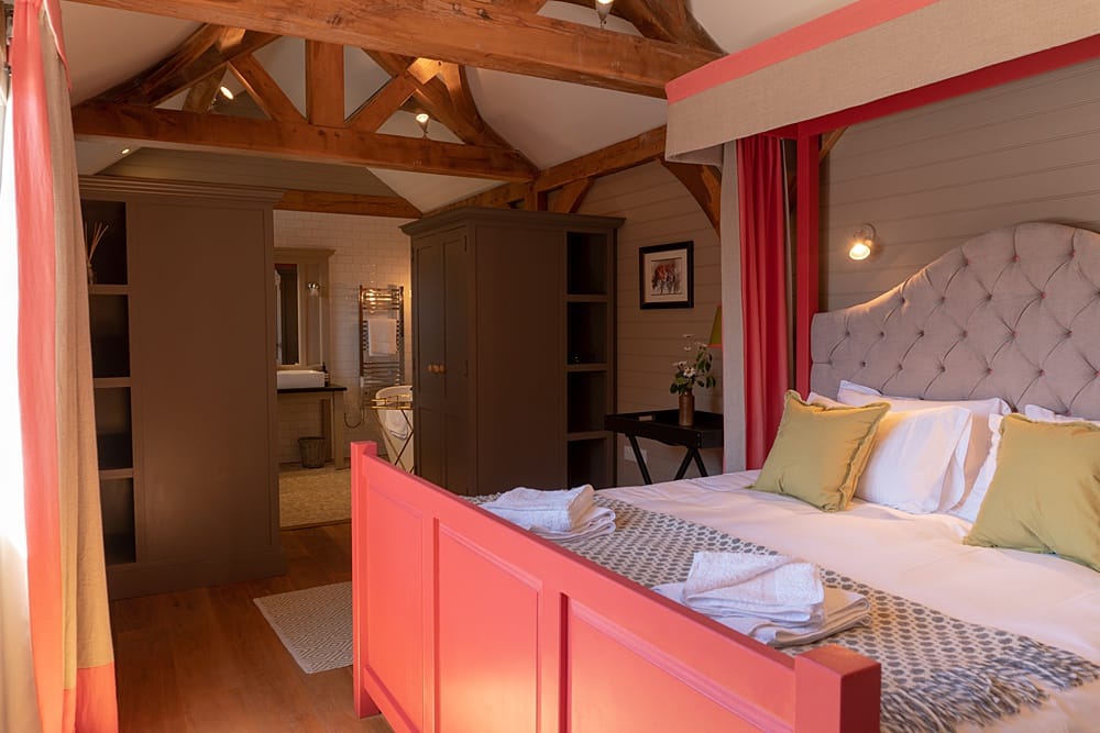 The accommodation at Retreat East is a collection of beautifully restored barns, bespoke shepherd’s huts, and eco-luxury suites, each thoughtfully designed to reflect the character and charm of the Suffolk countryside. Every space blends rustic features like exposed beams and reclaimed materials with modern touches, from plush king-size beds to underfloor heating and rainfall showers.