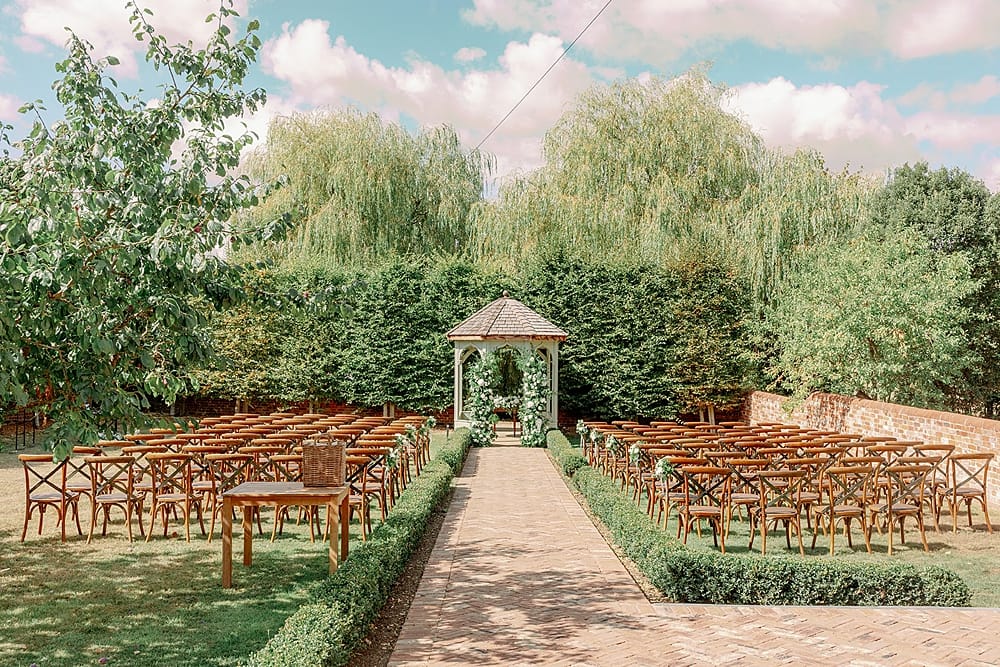 Nestled within the heart of the estate, The Farmhouse Garden is a romantic and serene outdoor space, perfect for al fresco ceremonies. Surrounded by fragrant herbs, wildflowers, and gently rustling trees, this walled garden feels intimate yet open, ideal for those dreaming of a countryside wedding in nature. At its centre stands a beautiful oak-framed pergola, a natural focal point for exchanging vows under Suffolk’s vast skies. During the spring and summer months, the garden bursts into colour, providing a lush, living backdrop that requires little decoration. It’s peaceful, private, and full of rustic charm – a picture-perfect spot for saying “I do.”