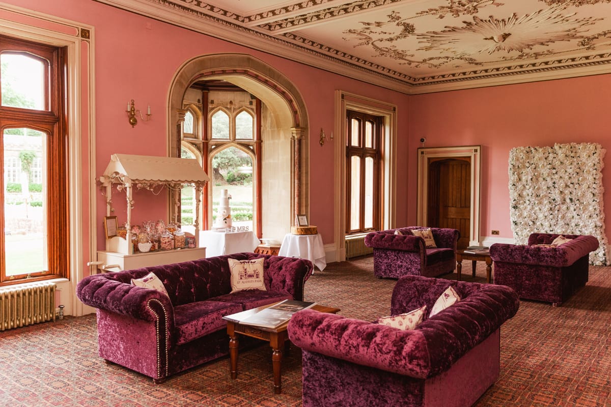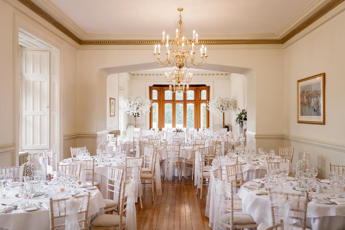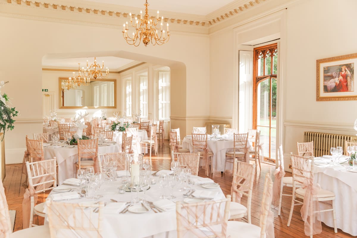 The stunning banqueting hall at St. Audries Park can accommodate up to 130 guests for the wedding breakfast. Several other grand and ornate reception rooms are also available. The venue can host up to 250 guests for evening celebrations, as the entire house and grounds are reserved exclusively for each event.