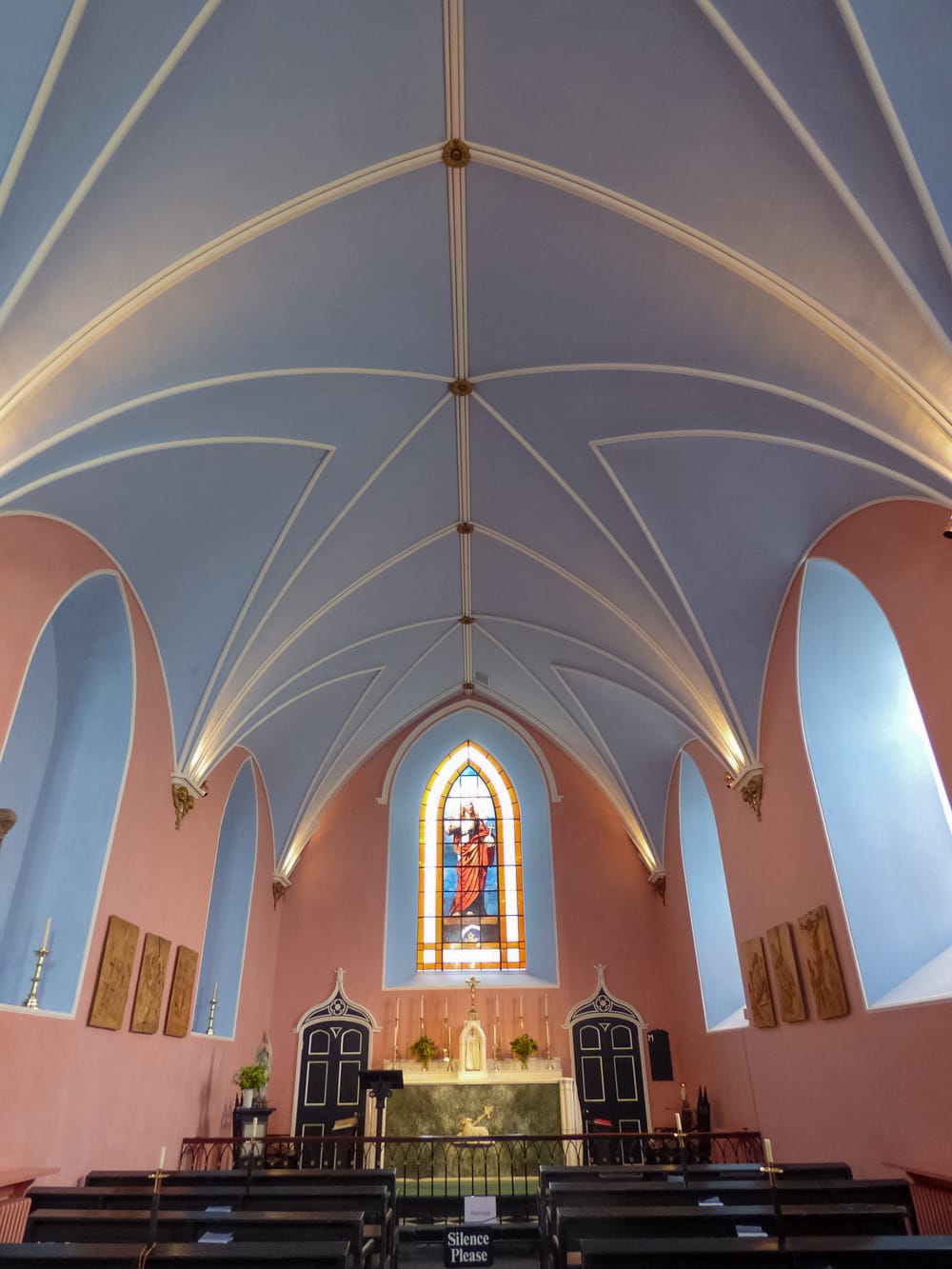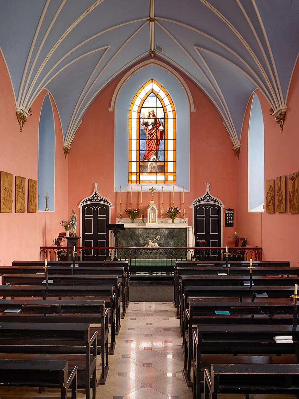 The on-site Catholic church provides a dedicated space for couples wishing to marry within their faith. Seating up to 80 guests, it offers an intimate setting suited to close family and friends. Architectural details include high arches, stained-glass windows, historic pews, and a traditional altar, all contributing to a sense of continuity and tradition. The church has served generations of worshippers, and that history remains central to its character today.